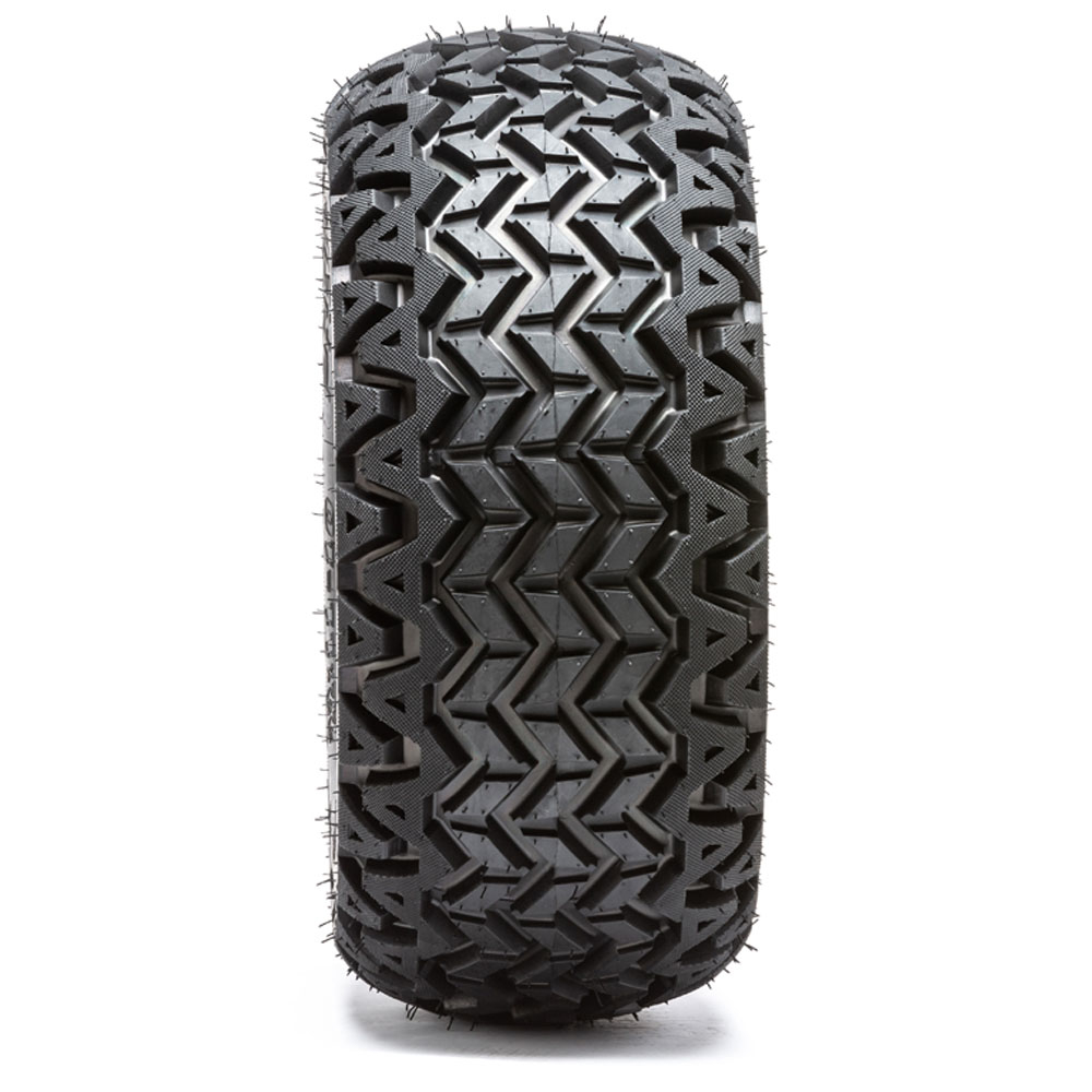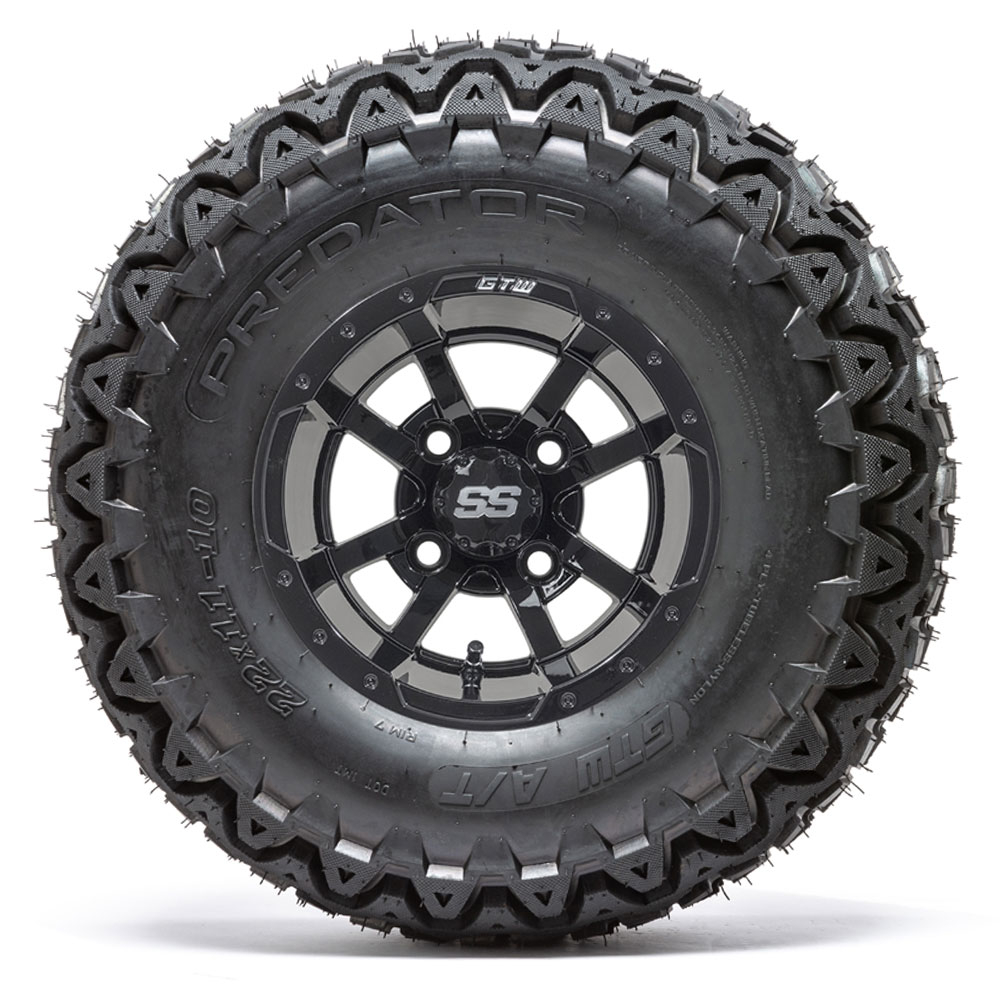A set of (4) 10-inch Storm Trooper black lifted golf cart wheels on 22-inch A/T tires