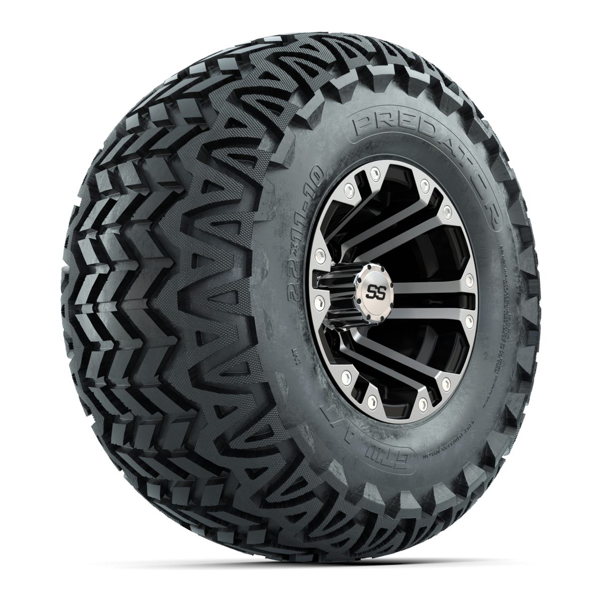 A set of (4) 10-inch Specter black/machined lifted golf cart wheels on 22-inch A/T tires