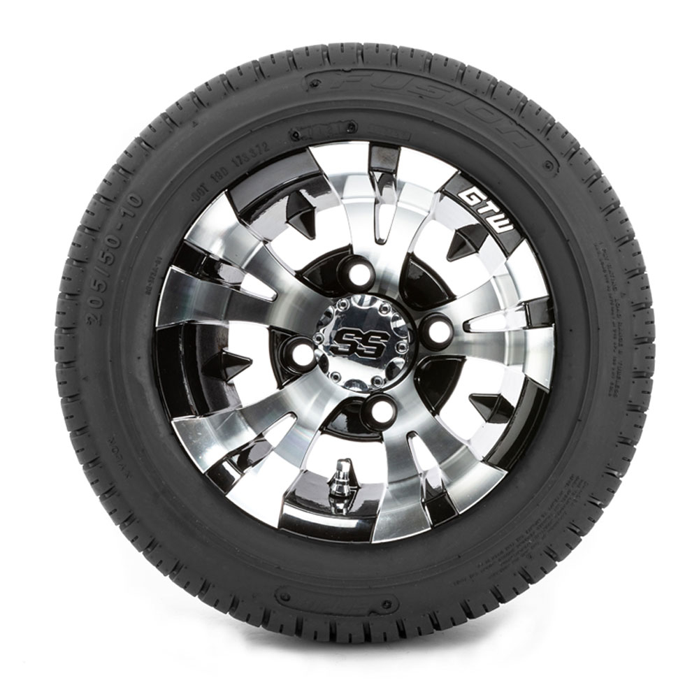A set of (4) 10-inch Vampire black/machined golf cart wheels on 205/50-10 (18-inch) tires
