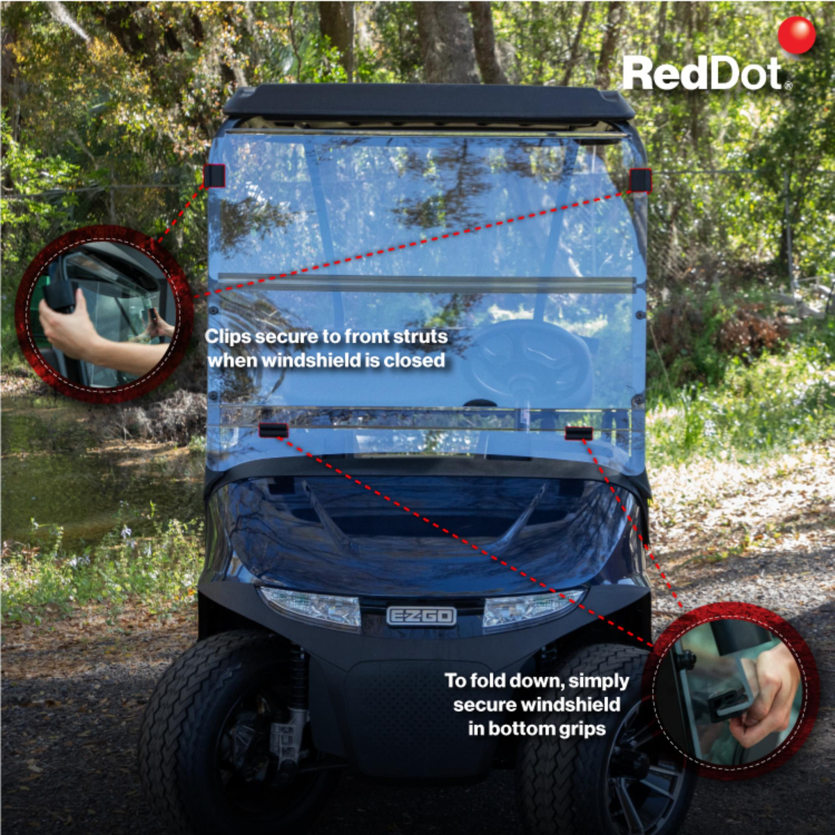 Upgrade your 2024+ E-Z-GO RXV with a folding windshield for year-round comfort and protection. Made from durable tinted acrylic, it reduces sun glare while providing excellent visibility. Its sturdy construction shields you from branches, rocks, and other debris. Enjoy an adjustable folding design that lets you customize your ride for any weather!
