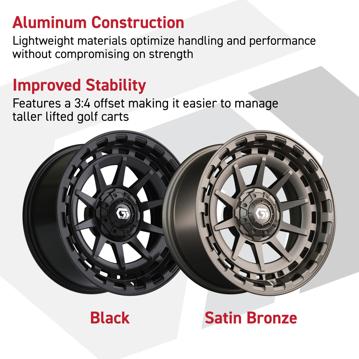 Upgrade your golf cart’s style with the Barricade Wheel. Its weatherproof construction protects against rust, ensuring your cart always looks sharp.