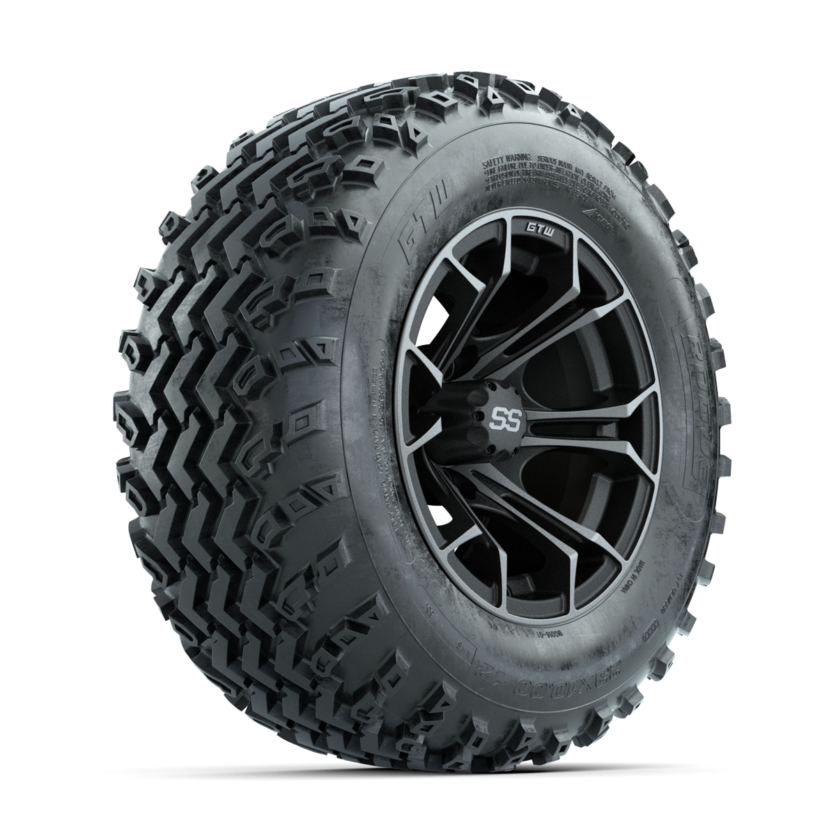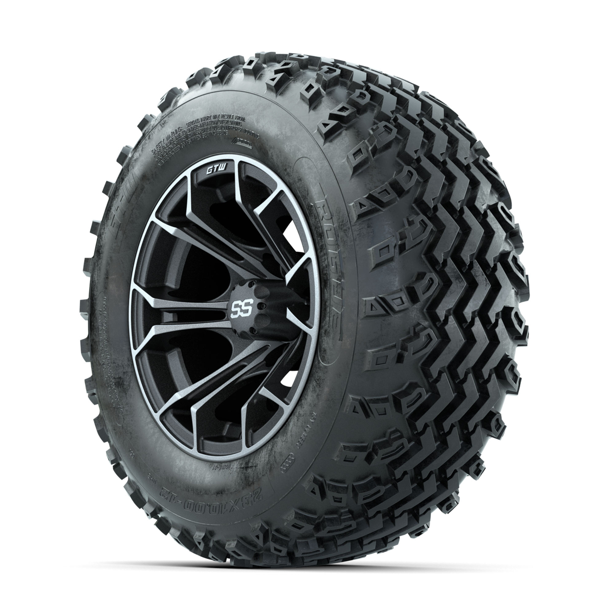 A set of (4) 12-inch GTW® Spyder Machined/Grey golf cart wheels Mounted on 23x10.00-12 Rogue All-Terrain Tires