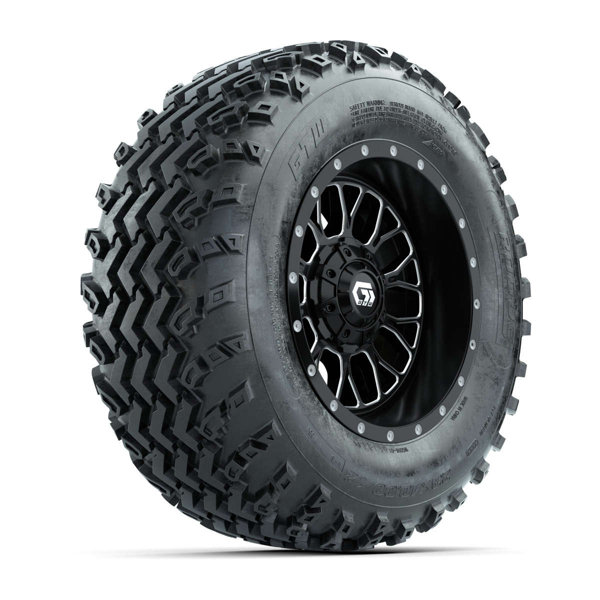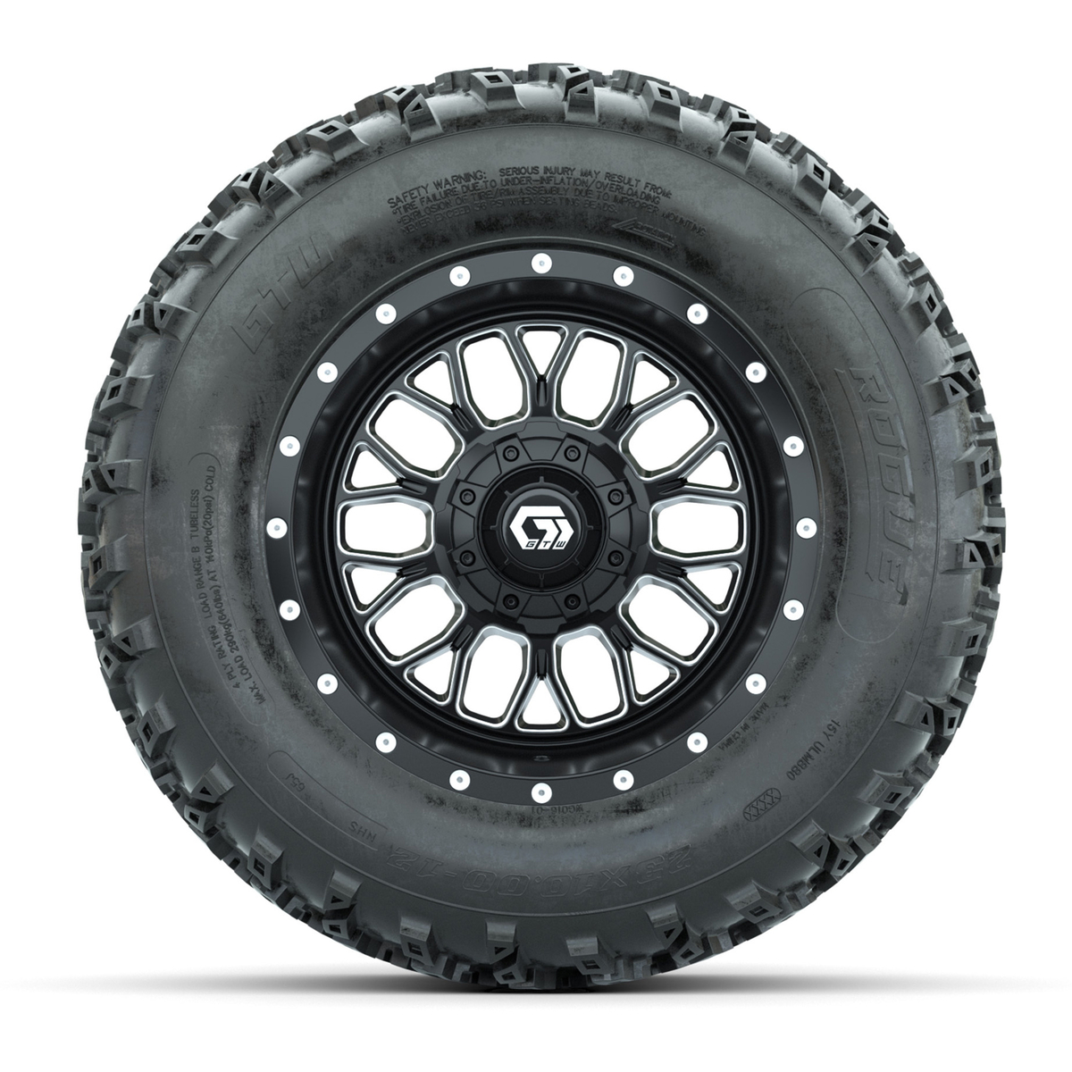 A set of (4) 12-inch GTW® Helix Machined/Black golf cart wheels Mounted on 23x10.00-12 Rogue All-Terrain Tires