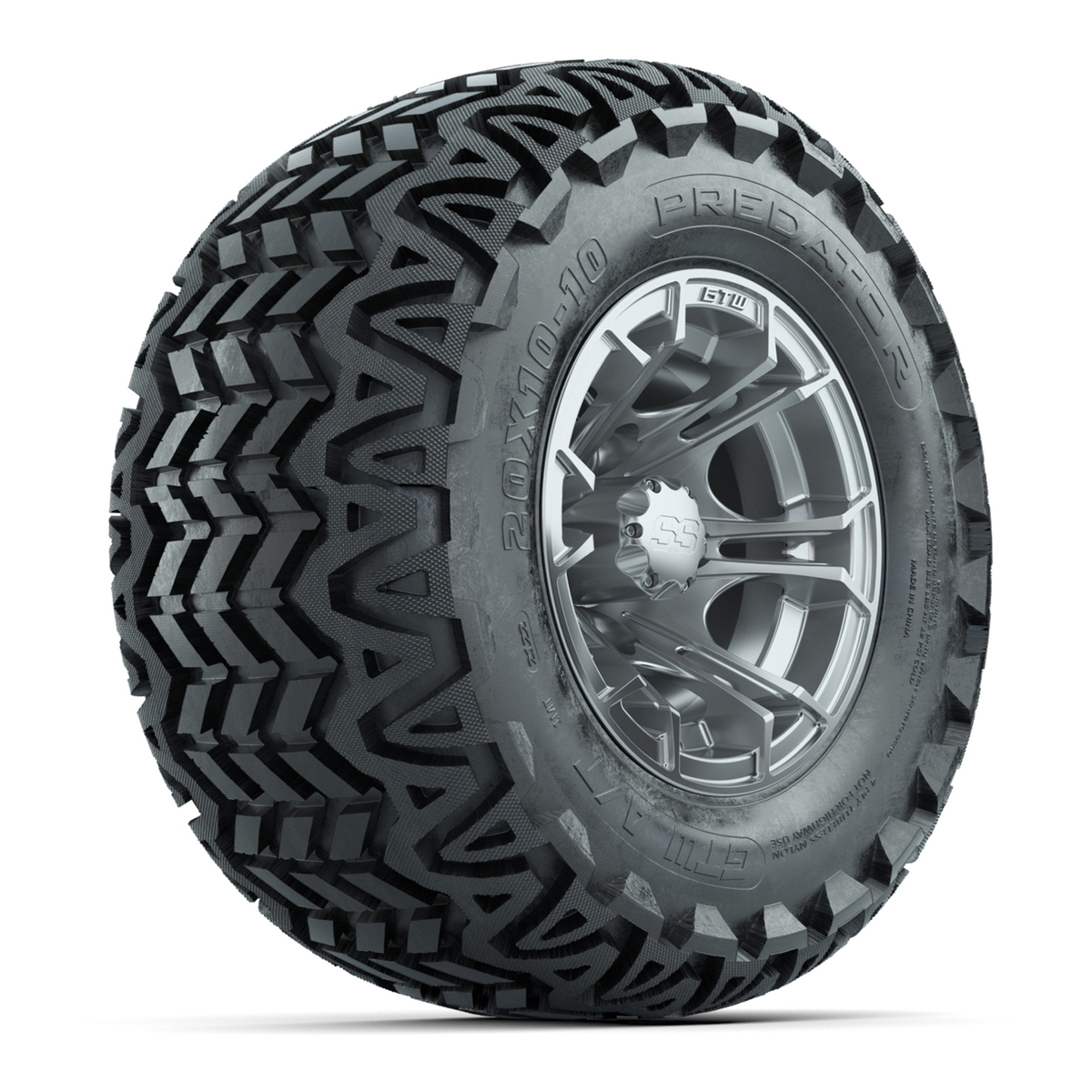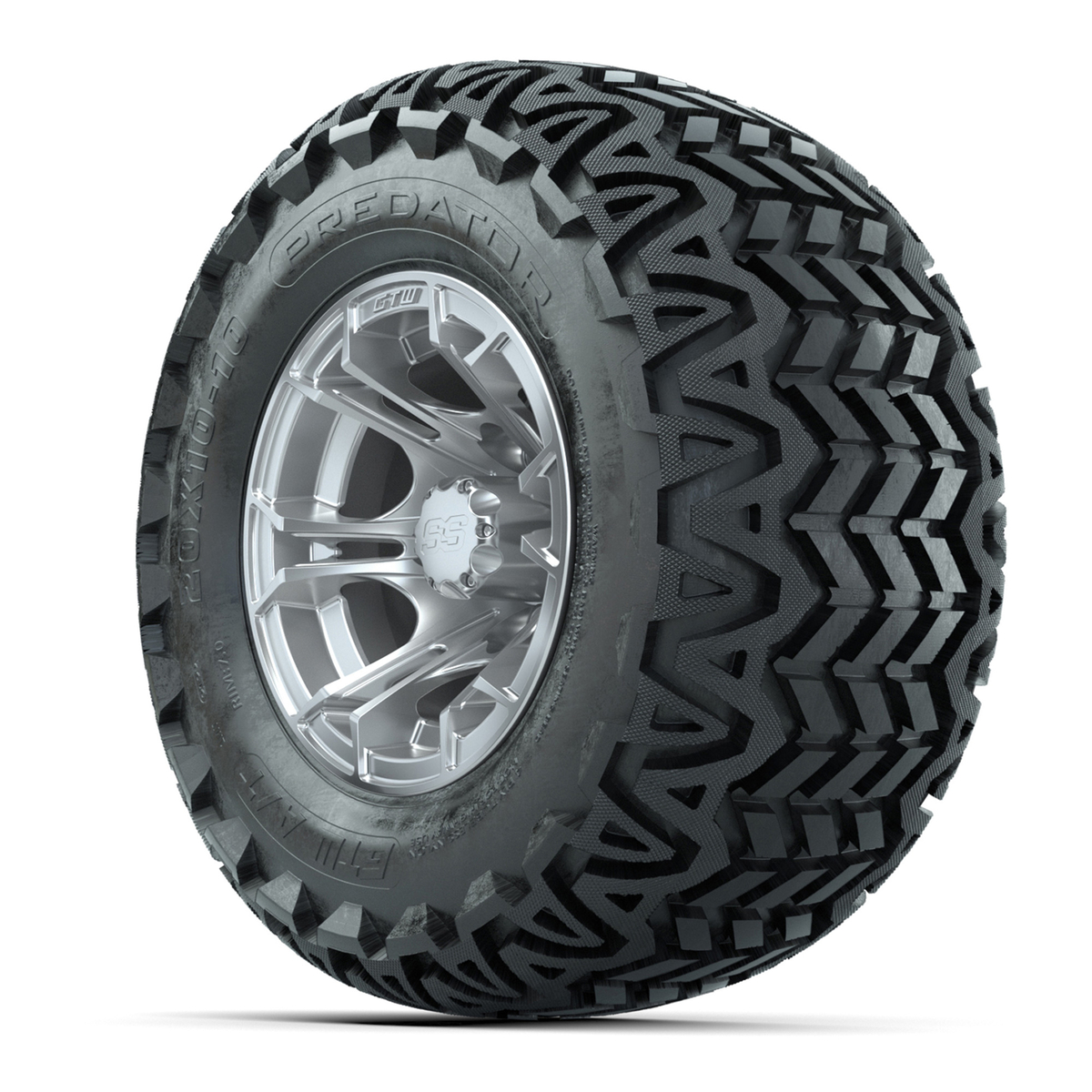 A set of (4) 10-inch GTW® Spyder Silver Brush golf cart wheels Mounted on 20x10-10 Predator All-Terrain Tires