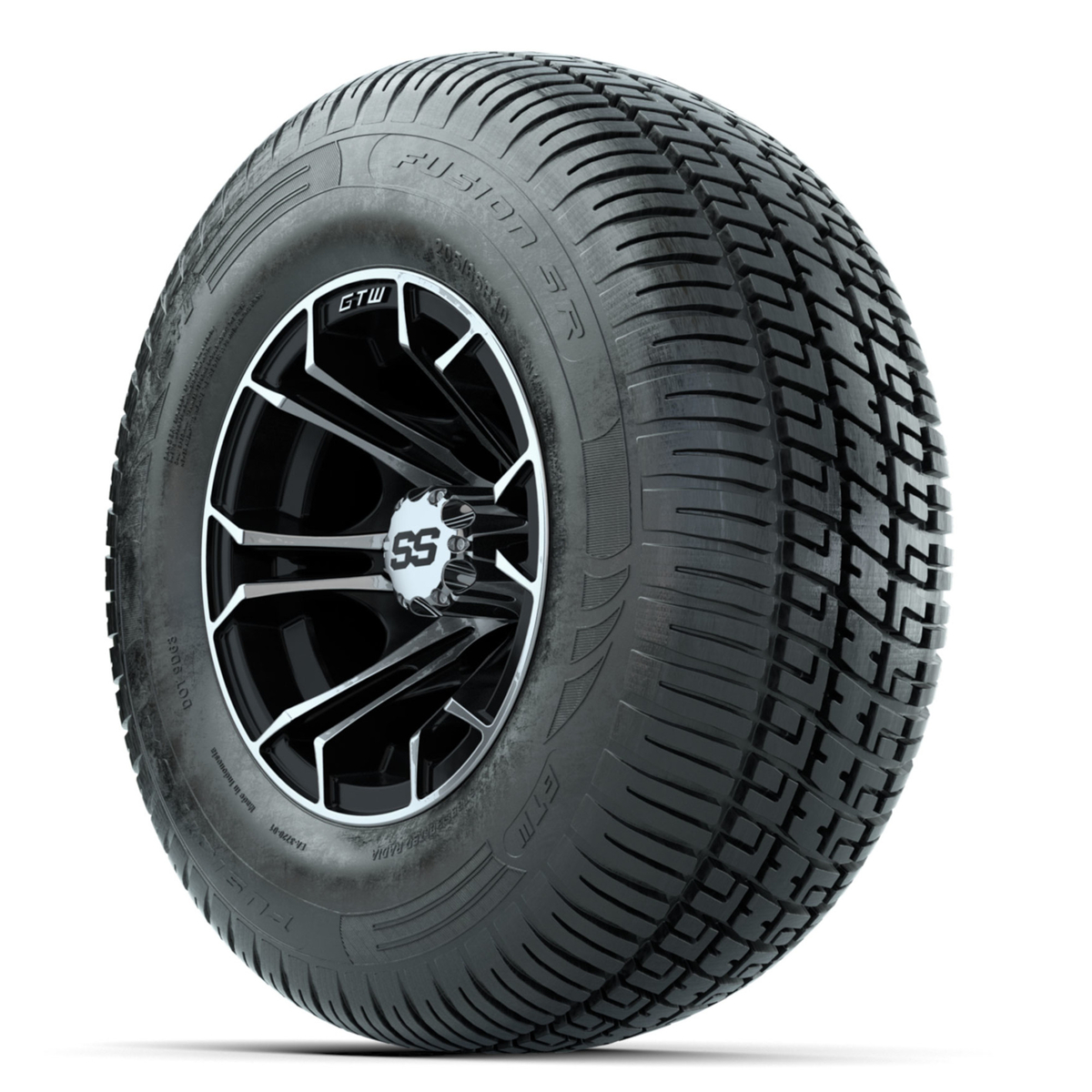 A set of (4) 10-inch GTW® Spyder Machined/Black golf cart wheels Mounted on 205/65-R10 Fusion SR Steel Belted Radial Tires