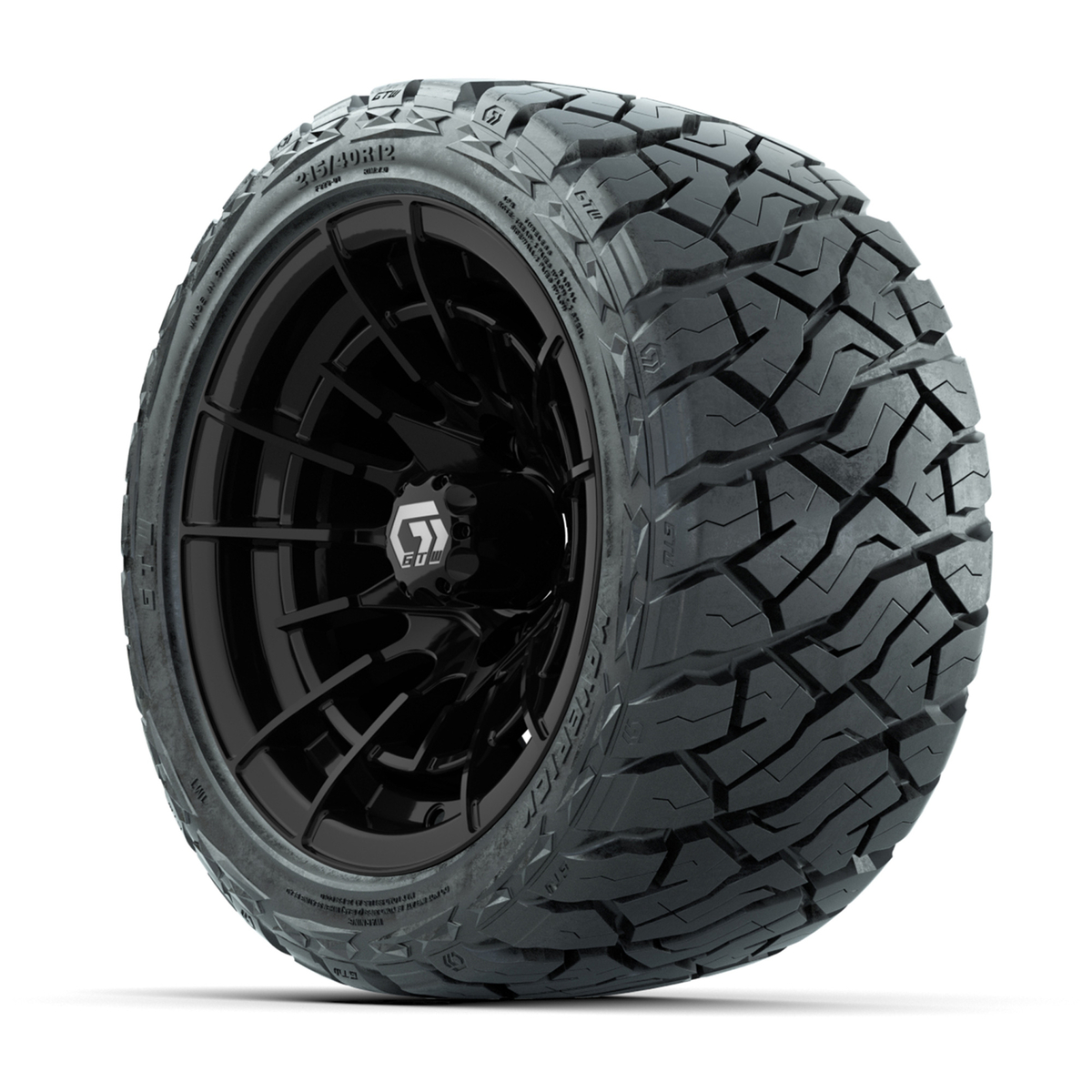 A set of (4) 12-inch GTW® Boost Gloss Black golf cart wheels Mounted on 215/40-R12 Maverick Low-Profile All-Terrain Tires