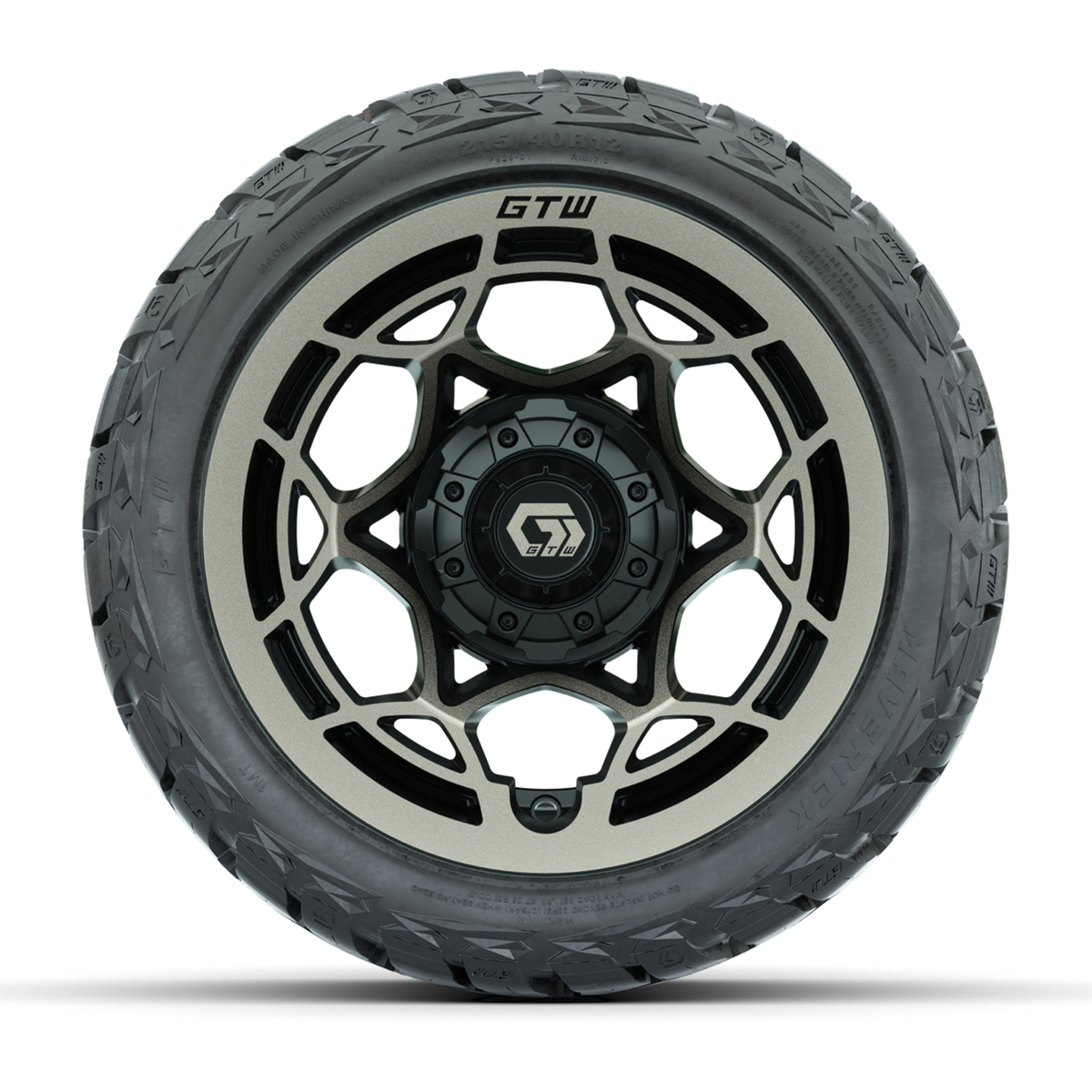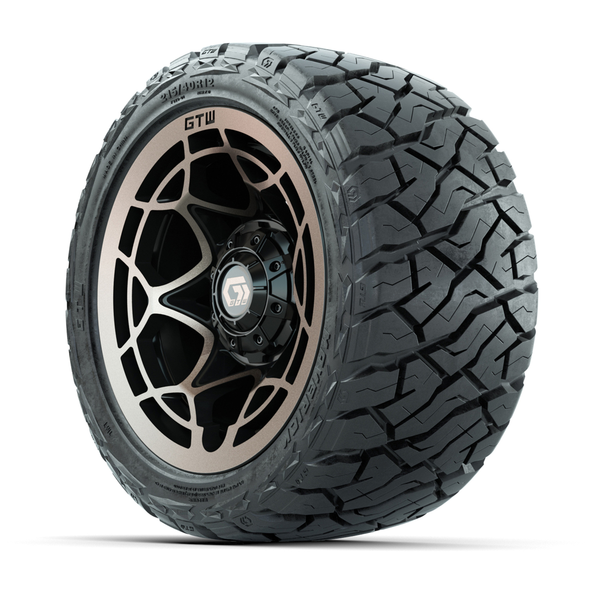 A set of (4) 12-inch GTW® Nexus Gloss Black/Satin Bronze golf cart wheels Mounted on 215/40-R12 Maverick Low-Profile All-Terrain Tires