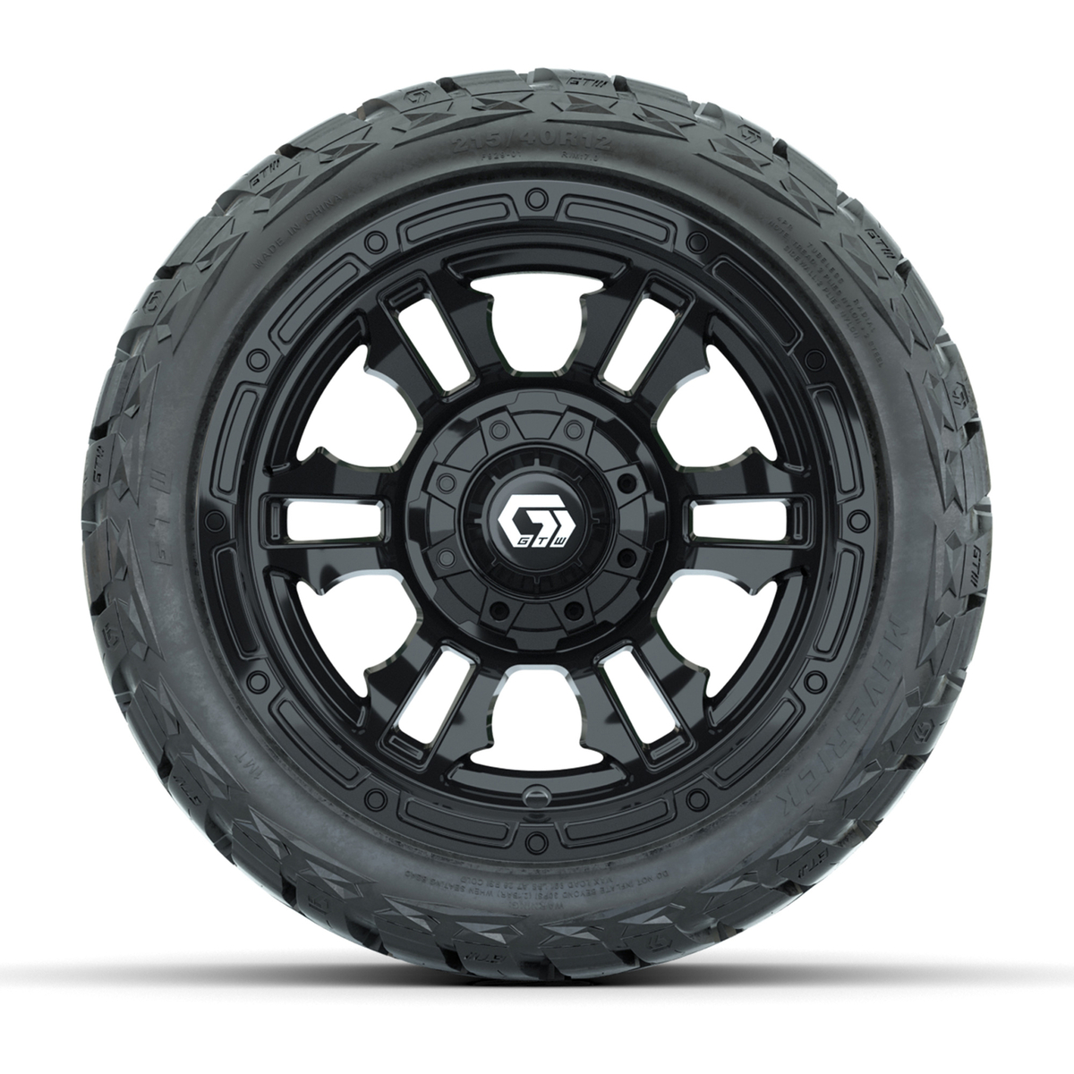A set of (4) 12-inch GTW® Shogun Gloss Black golf cart wheels Mounted on 215/40-R12 Maverick Low-Profile All-Terrain Tires