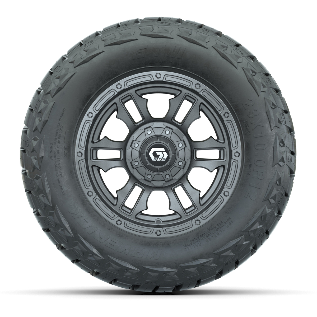 A set of (4) 12-inch GTW® Shogun Gloss Gunmetal golf cart wheels Mounted on 23x10.00-R12 Maverick All-Terrain Tires