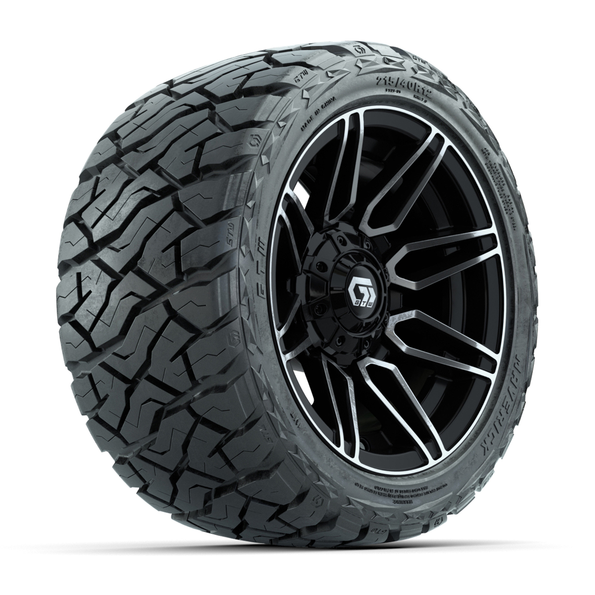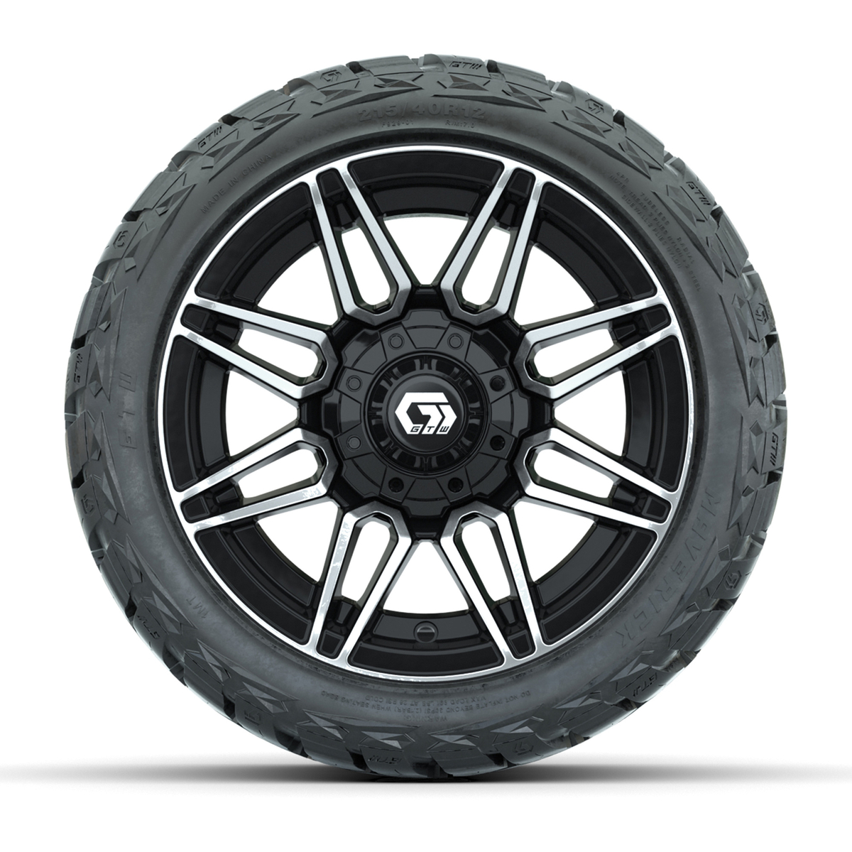 A set of (4) 12-inch GTW® Stealth Gloss Black & Machined golf cart wheels Mounted on 215/40-R12 Maverick Low-Profile All-Terrain Tires