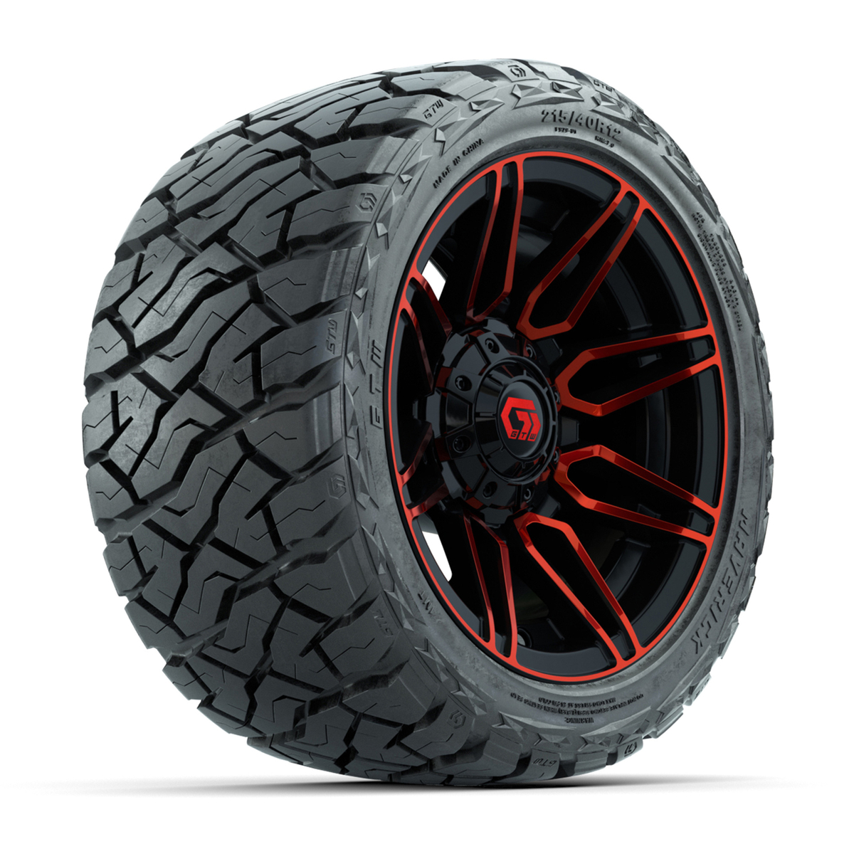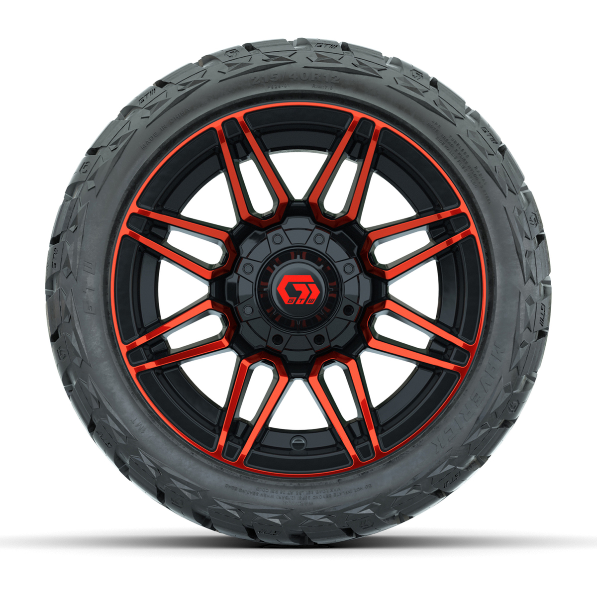 A set of (4) 12-inch GTW® Stealth Gloss Black/Red golf cart wheels Mounted on 215/40-R12 Maverick Low-Profile All-Terrain Tires