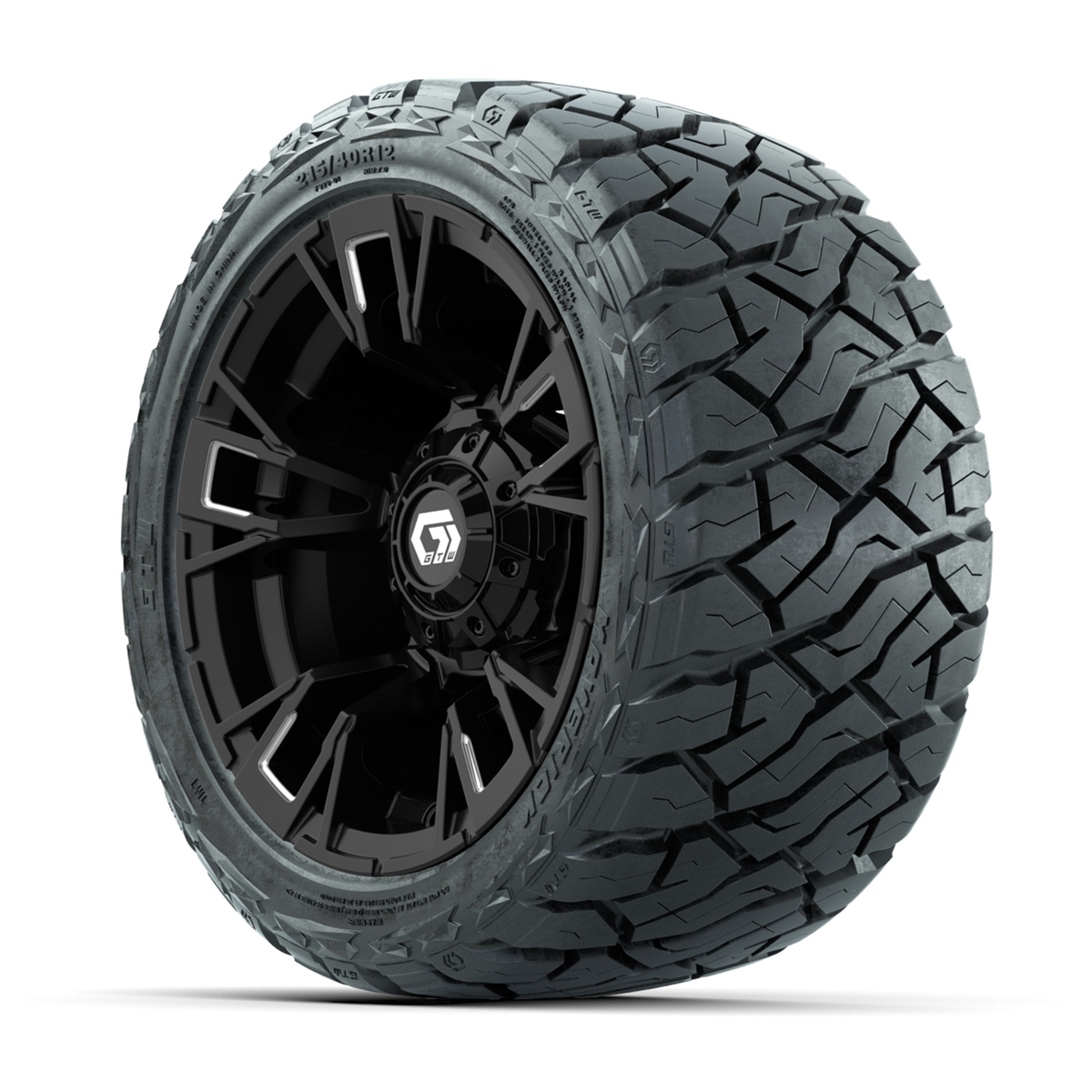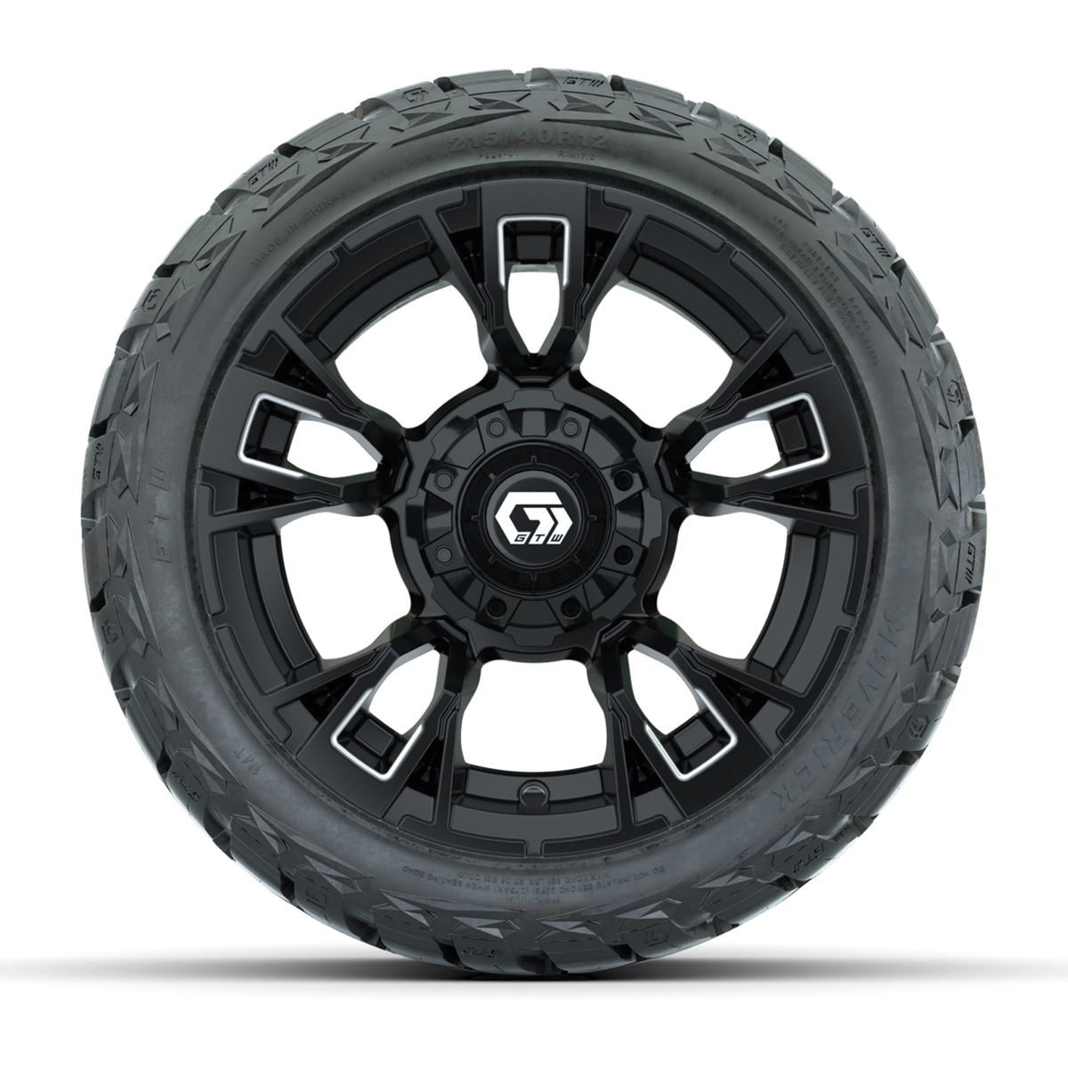 A set of (4) 12-inch GTW® Vandal Matte Black/Machined golf cart wheels Mounted on 215/40-R12 Maverick Low-Profile All-Terrain Tires