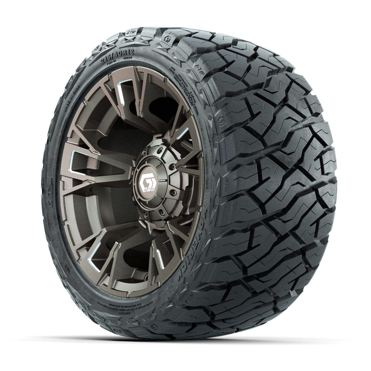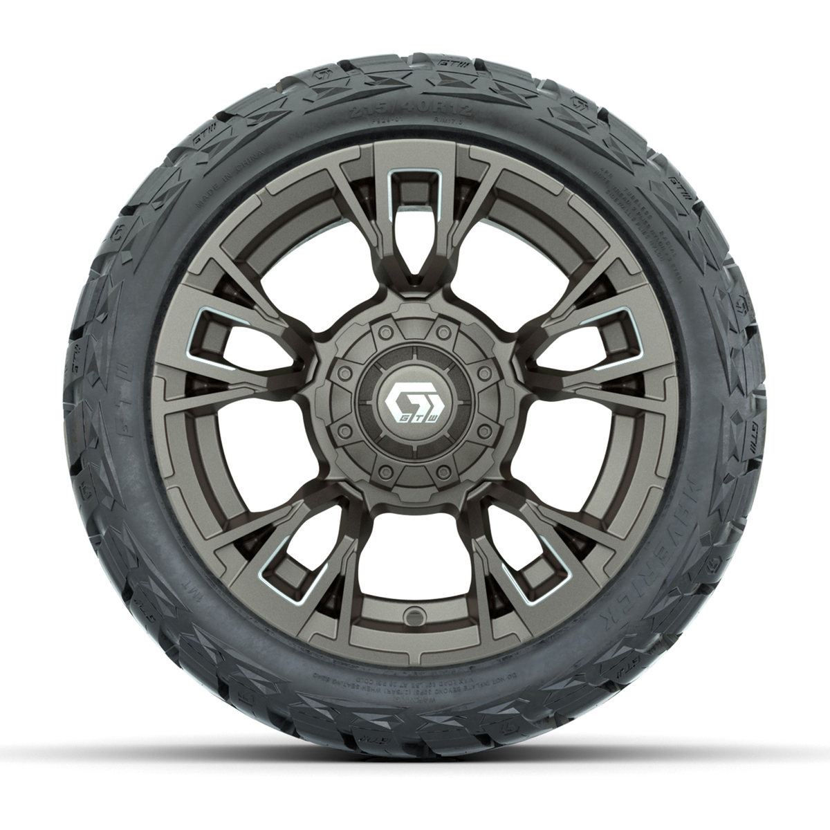 A set of (4) 12-inch GTW® Vandal Satin Bronze/Machined golf cart wheels Mounted on 215/40-R12 Maverick Low-Profile All-Terrain Tires