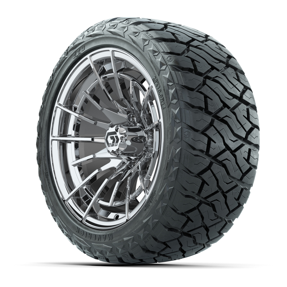 A set of (4) 14-inch GTW® Boost Chrome golf cart wheels Mounted on 23x10.00-R14 Maverick All-Terrain Tires