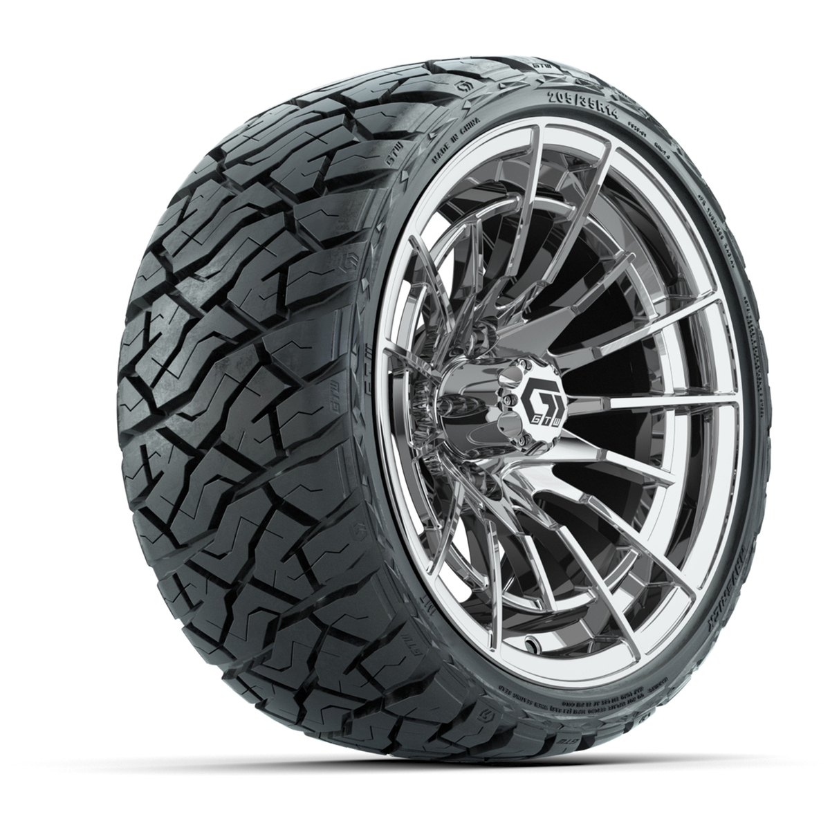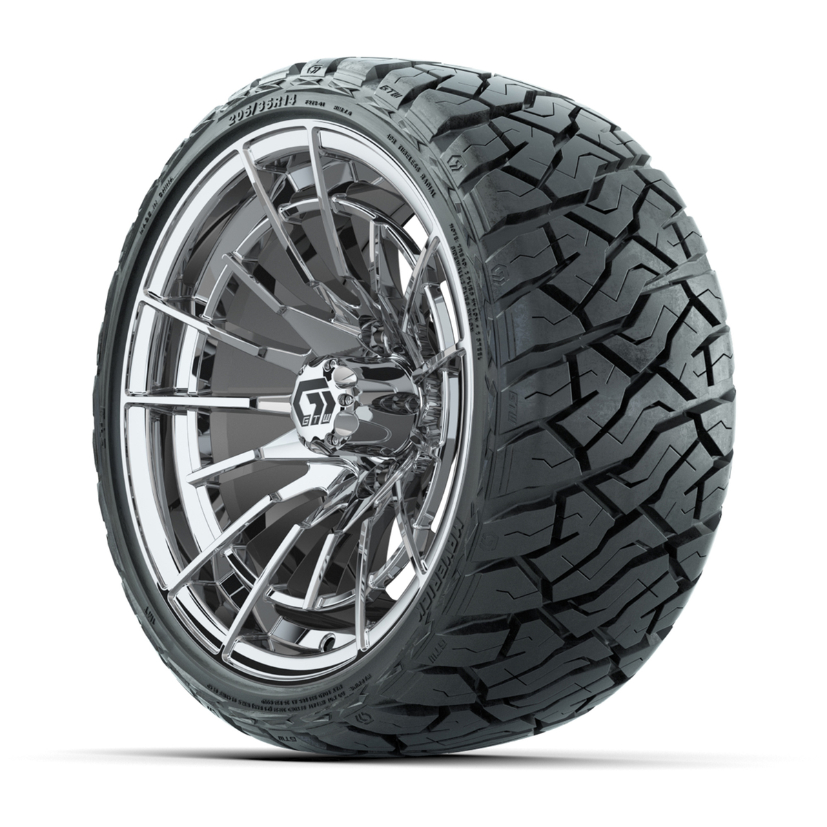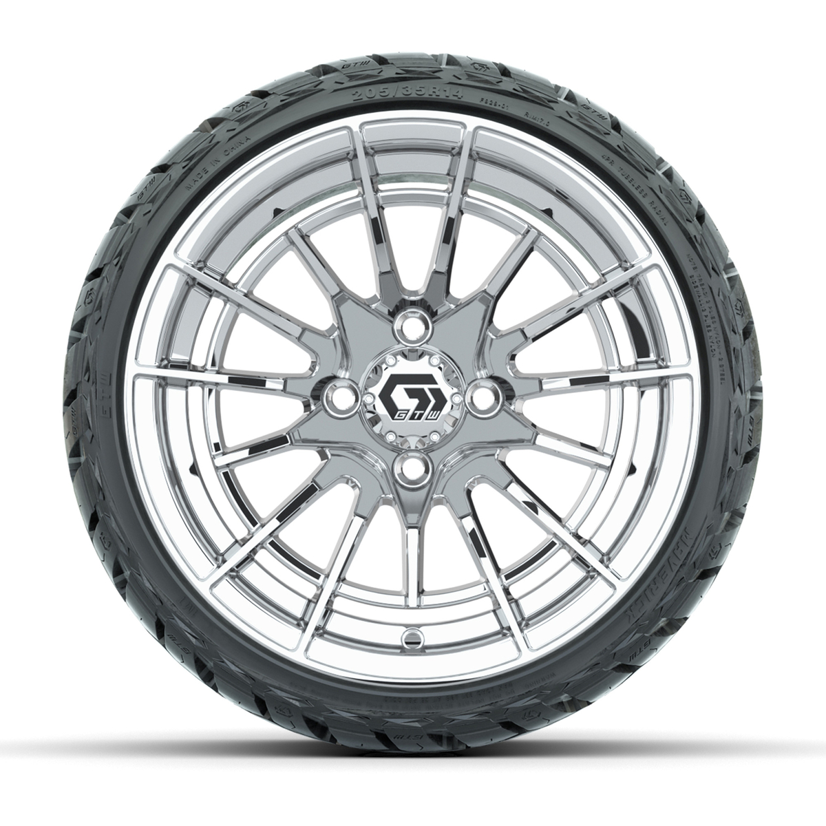 A set of (4) 14-inch GTW® Boost Chrome golf cart wheels Mounted on 205/35-R14 Maverick Low-Profile All-Terrain Tires