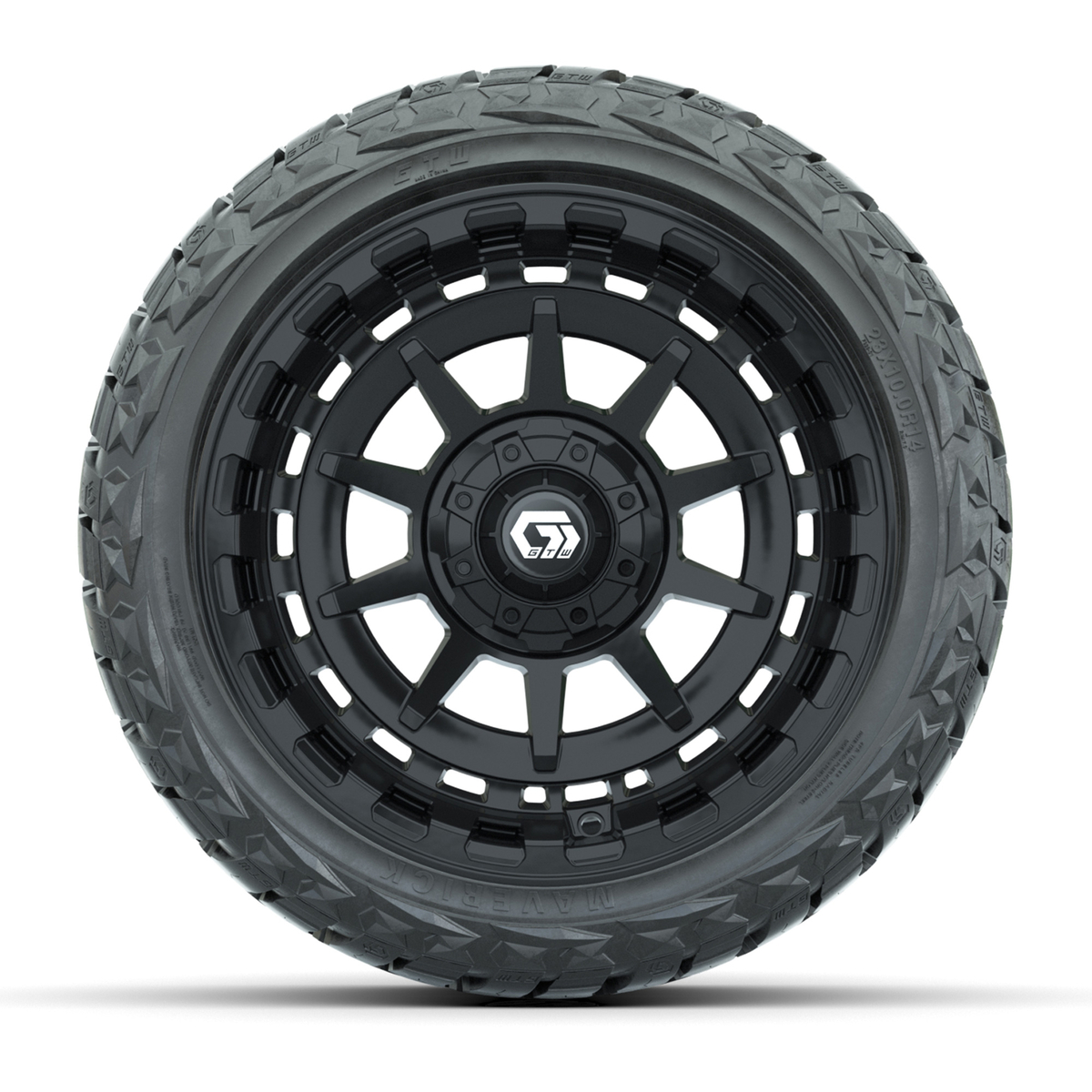 A set of (4) 14-inch GTW® Barricade Gloss Black golf cart wheels Mounted on 23x10.00-R14 Maverick All-Terrain Tires