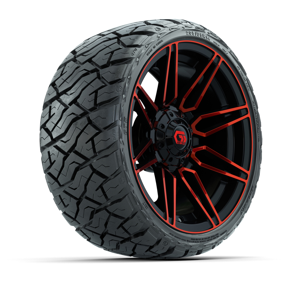 A set of (4) 14-inch GTW® Stealth Gloss Black/Red golf cart wheels Mounted on 205/35-R14 Maverick Low-Profile All-Terrain Tires