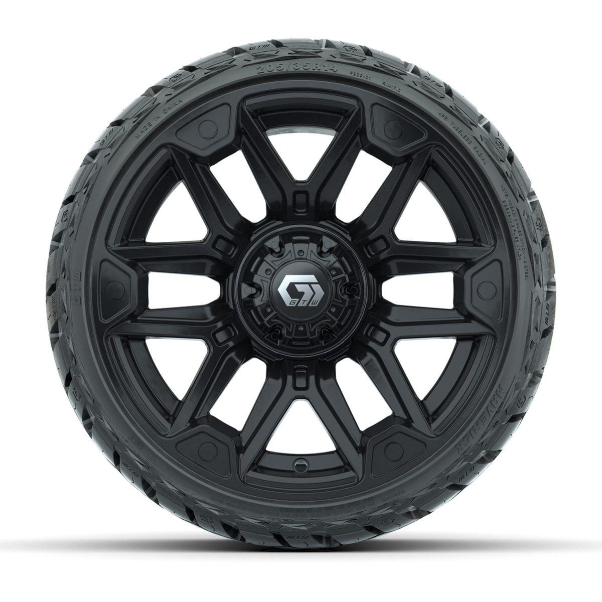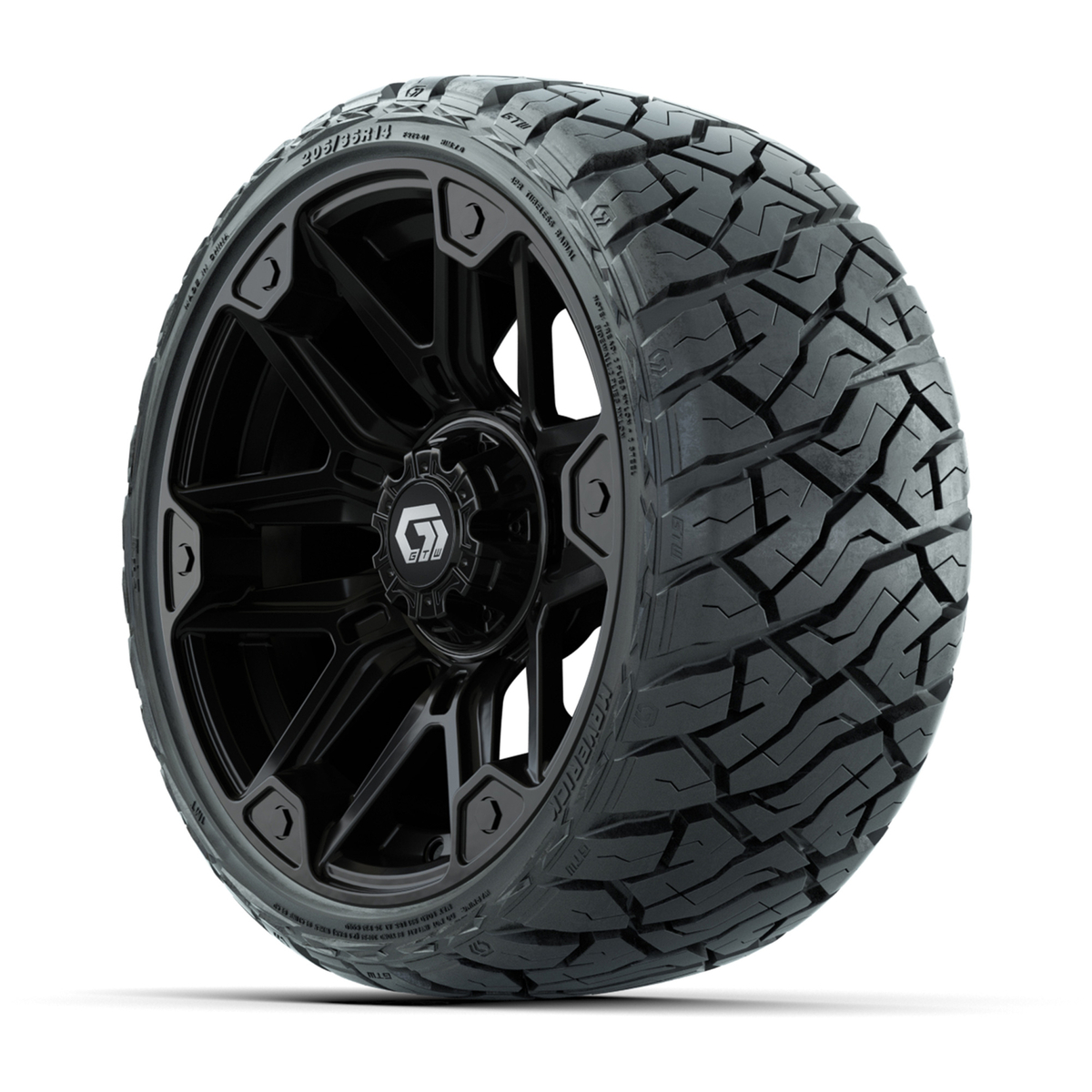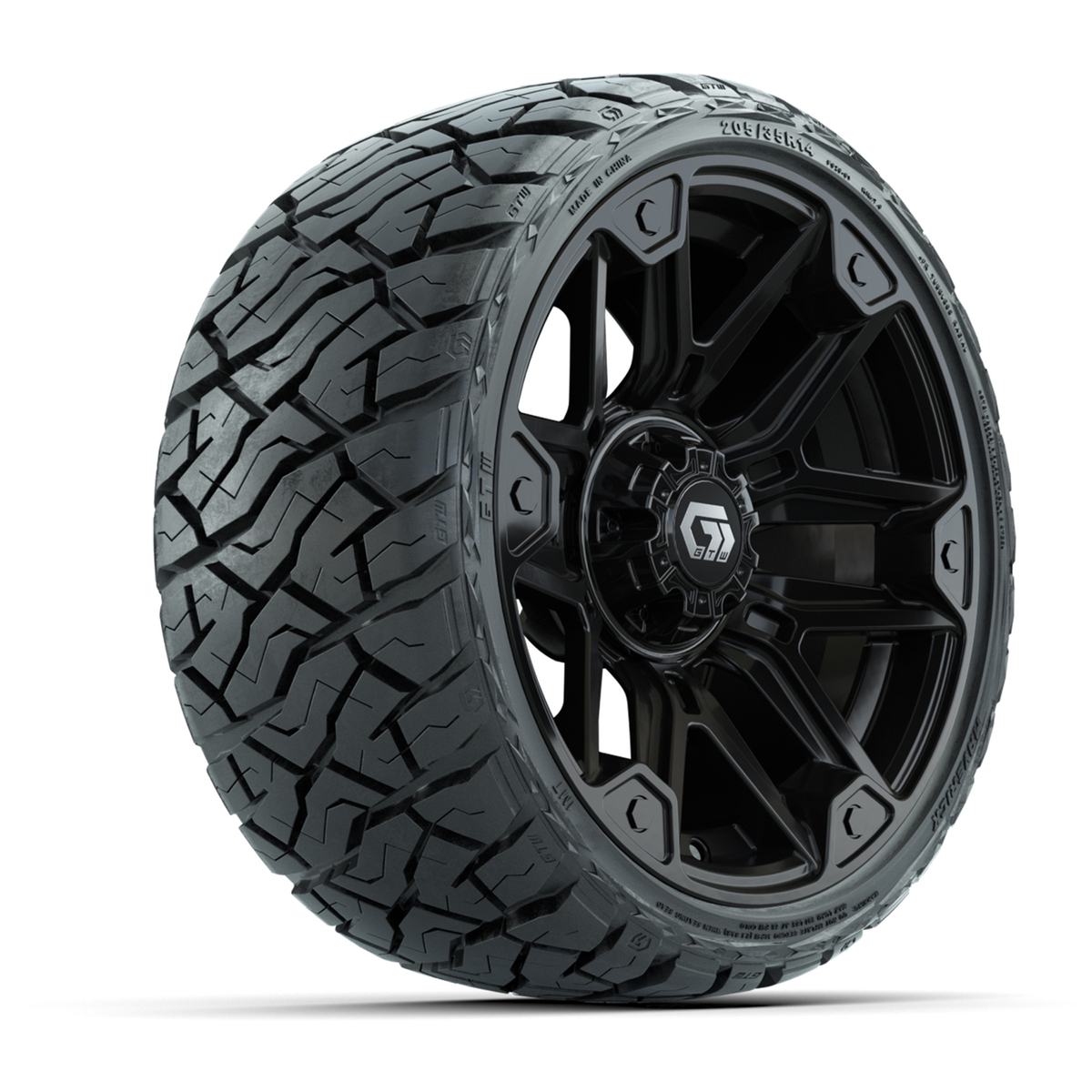 A set of (4) 14-inch GTW® Graffiti Gloss Black golf cart wheels Mounted on 205/35-R14 Maverick Low-Profile All-Terrain Tires
