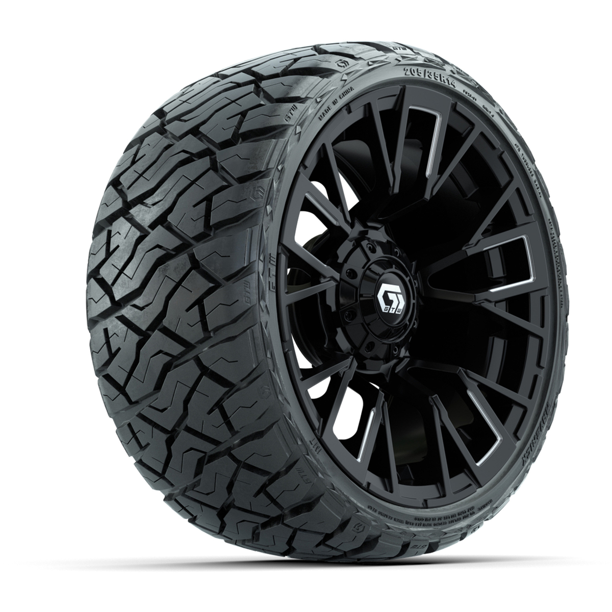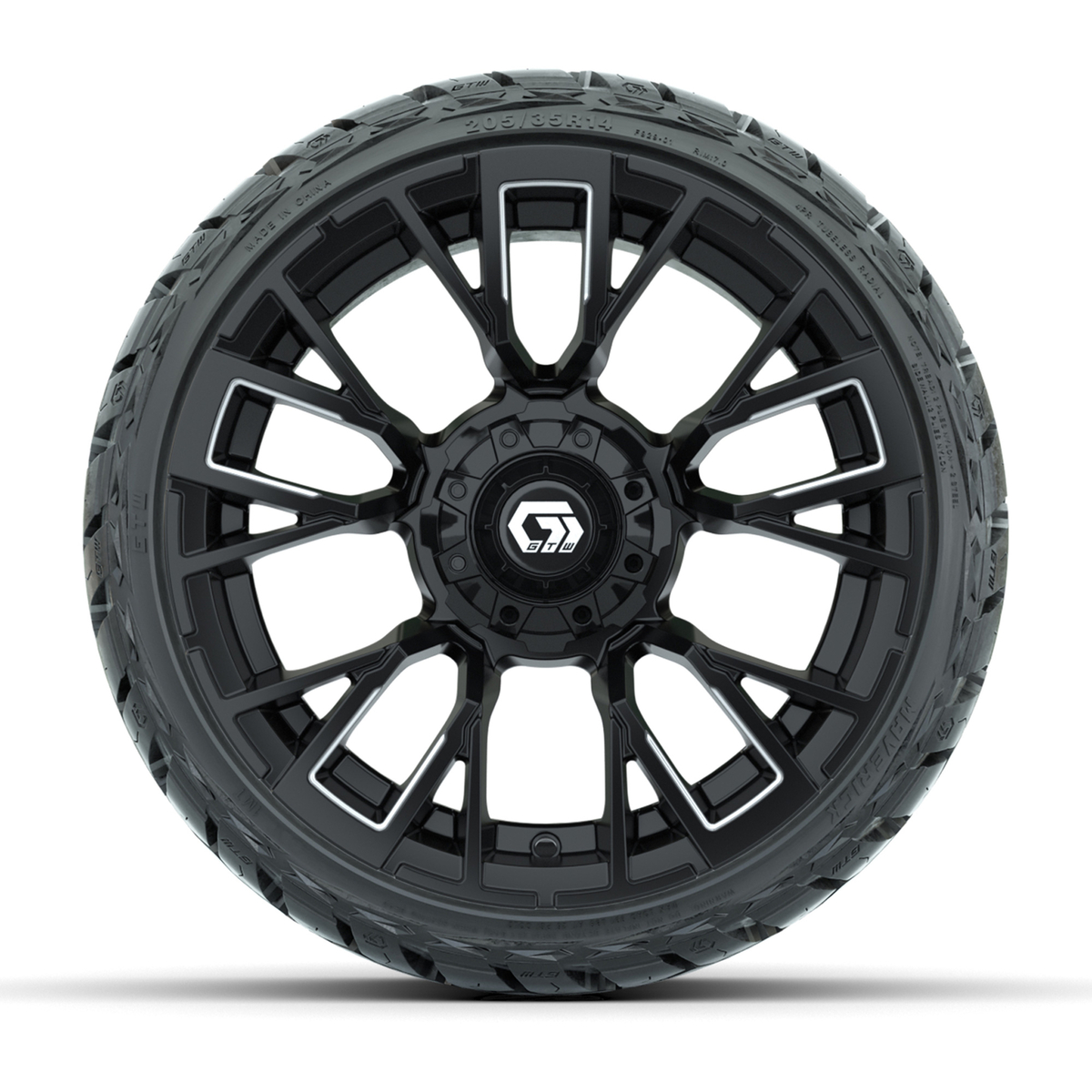 A set of (4) 14-inch GTW® Vandal Matte Black/Machined golf cart wheels Mounted on 205/35-R14 Maverick Low-Profile All-Terrain Tires