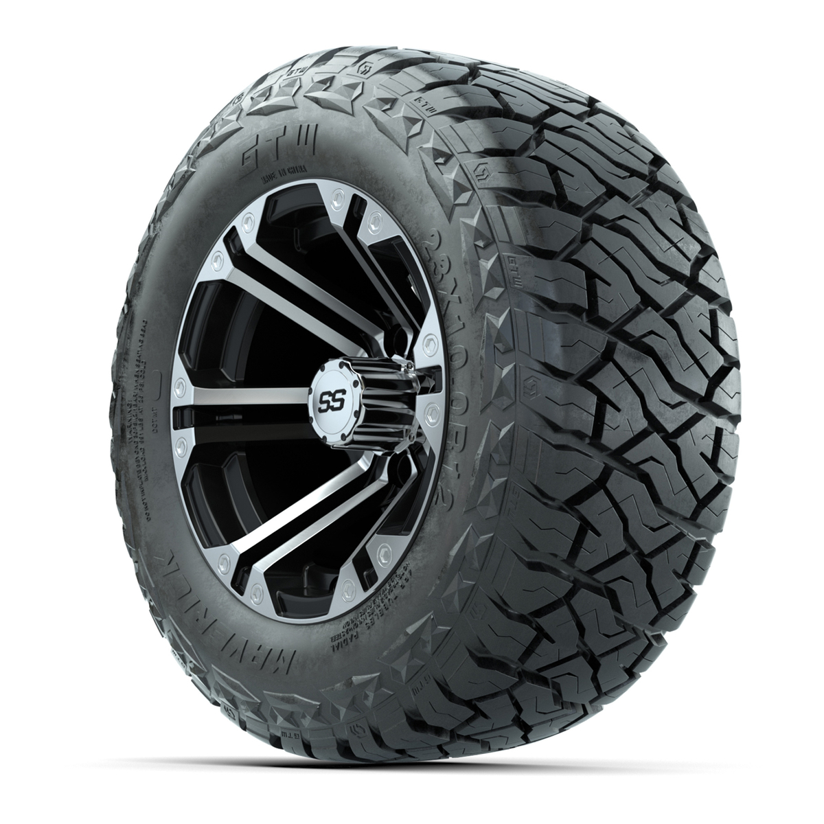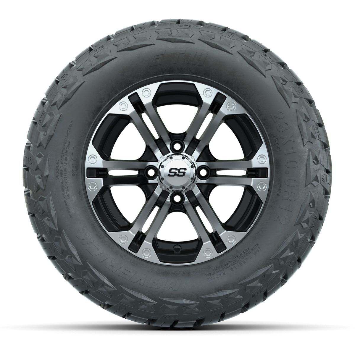 A set of (4) 12-inch GTW® Specter Black/Machined golf cart wheels Mounted on 23x10.00-R12 Maverick All-Terrain Tires