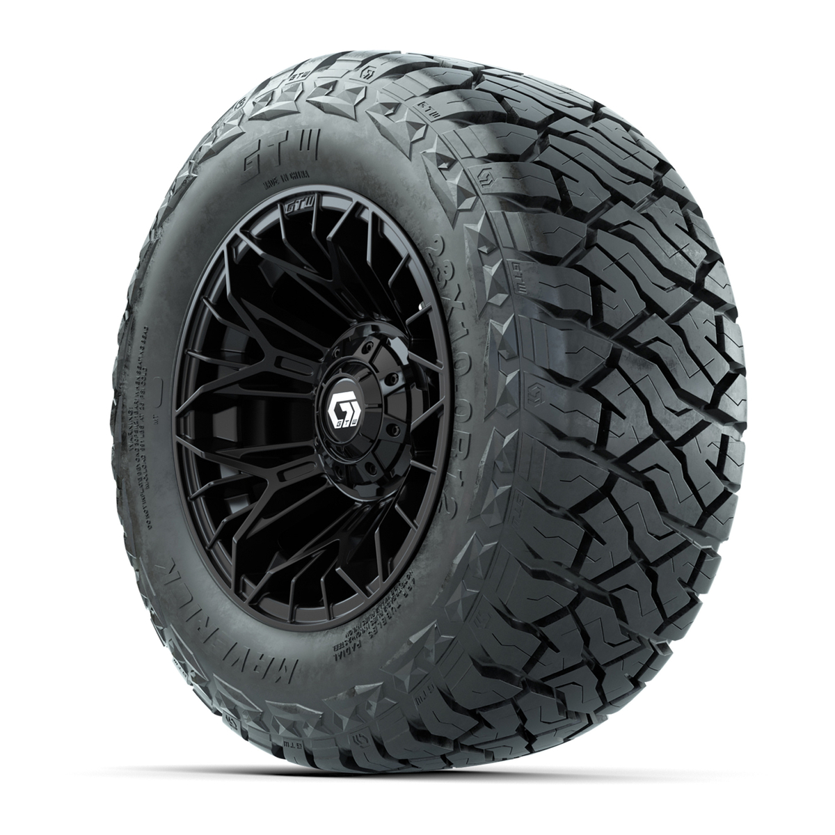 A set of (4) 12-inch GTW® Stellar Matte Black golf cart wheels Mounted on 23x10.00-R12 Maverick All-Terrain Tires