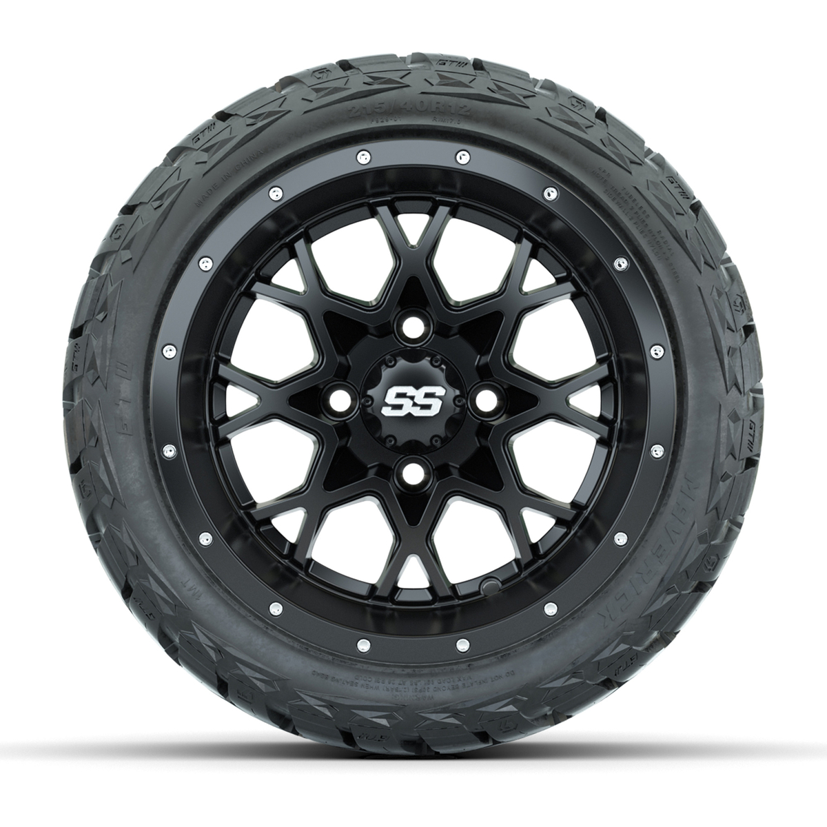 A set of (4) 12-inch GTW® Vortex Matte Black golf cart wheels Mounted on 215/40-R12 Maverick Low-Profile All-Terrain Tires
