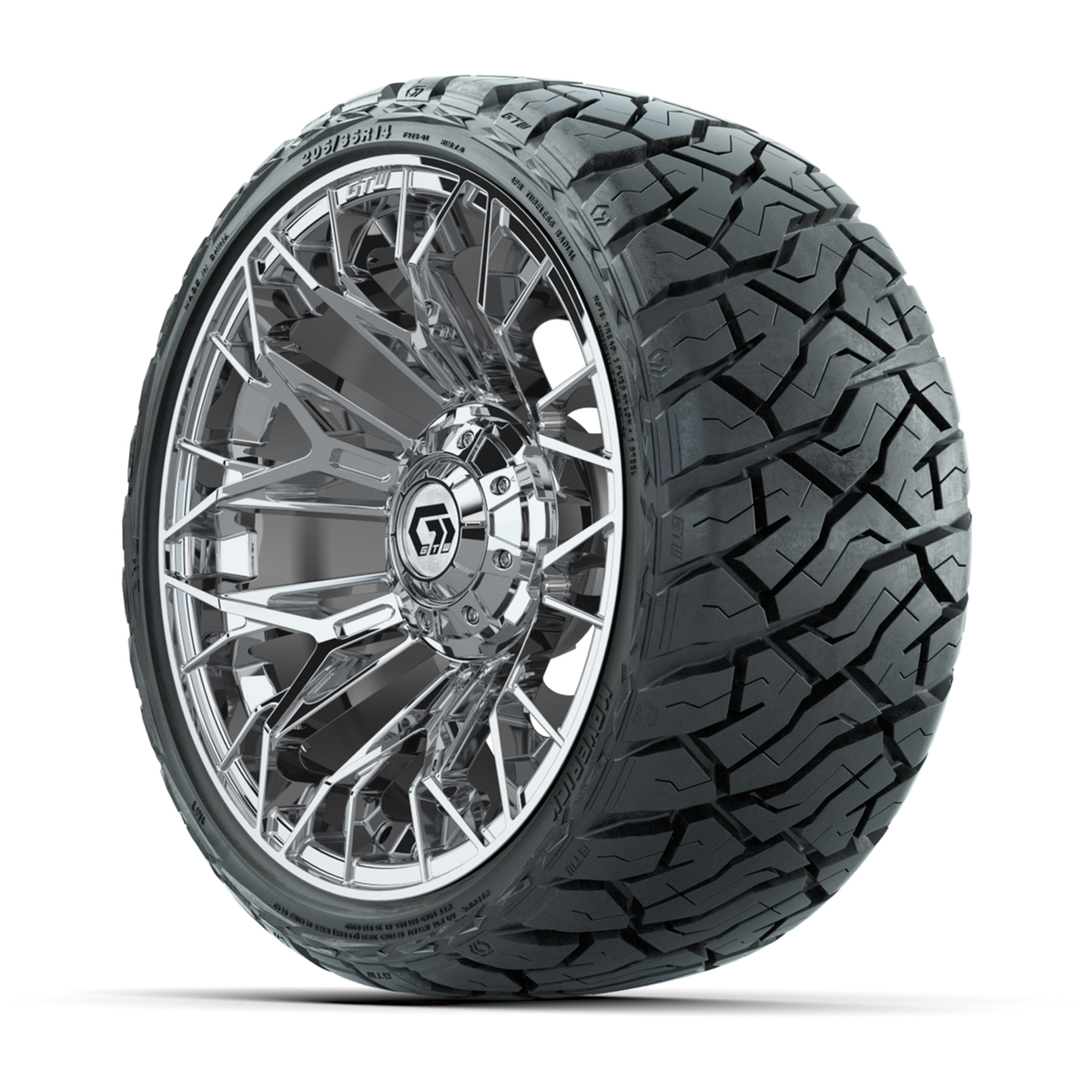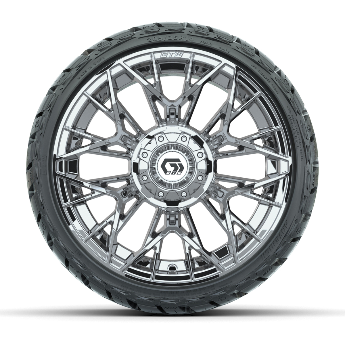 A set of (4) 14-inch GTW® Stellar Chrome golf cart wheels Mounted on 205/35-R14 Maverick Low-Profile All-Terrain Tires