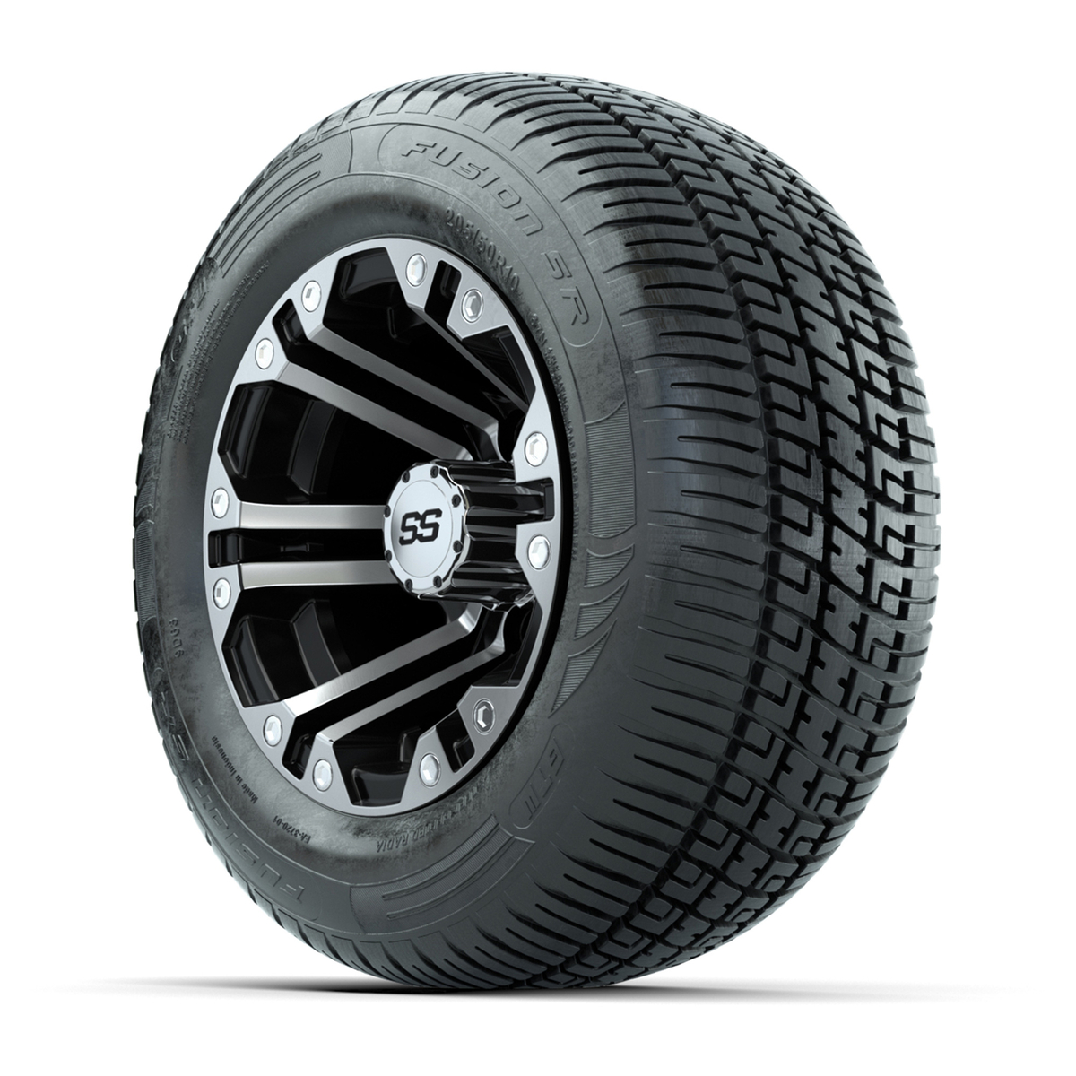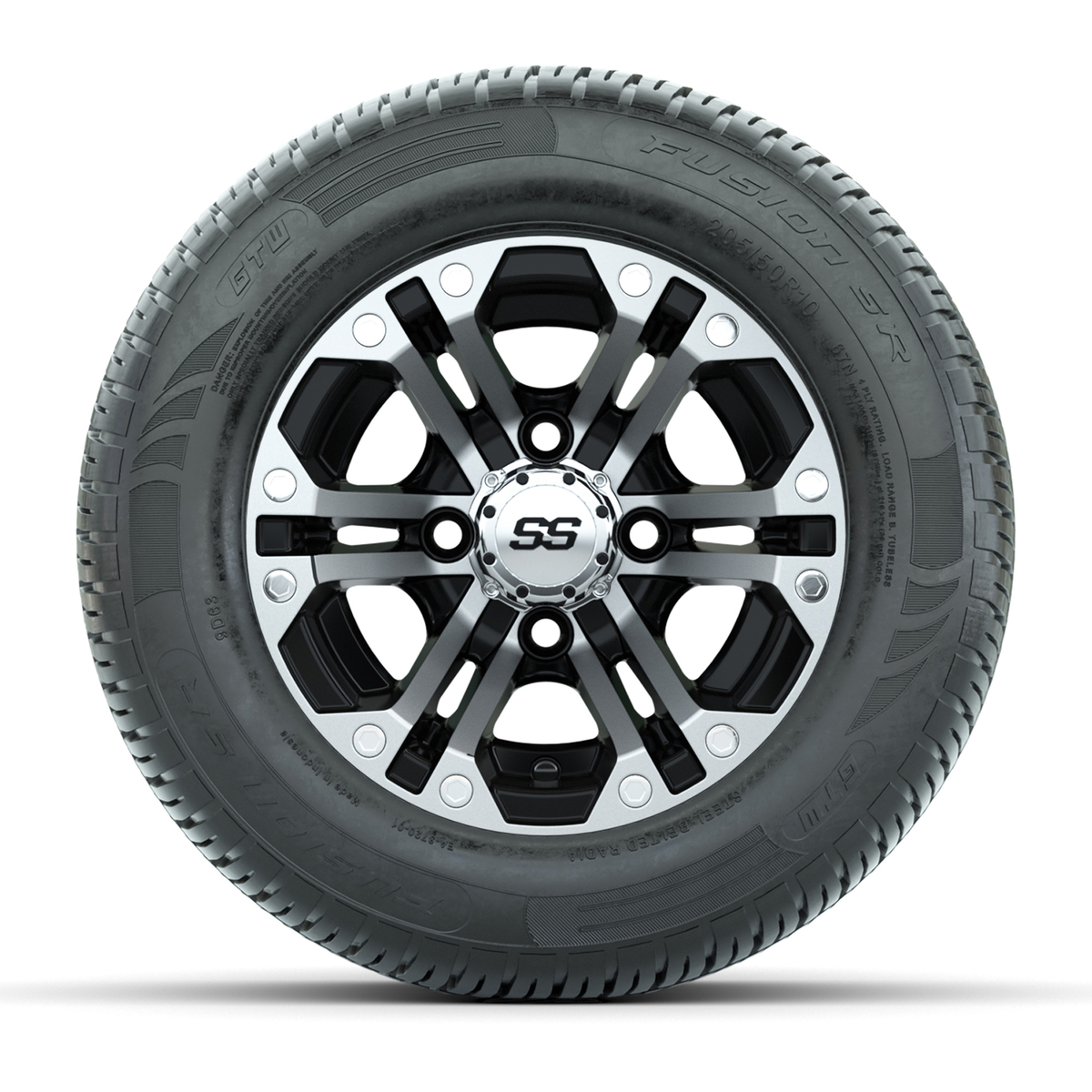 A set of (4) 10-inch GTW® Specter Black/Machined golf cart wheels mounted on 205/50-R10 Fusion S/R Radial Steel Belt Street Tires