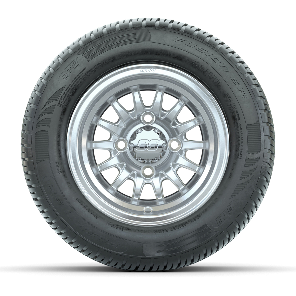 A set of (4) 10-inch GTW® Medusa Silver/Machined golf cart wheels mounted on 205/50-R10 Fusion S/R Radial Steel Belt Street Tires