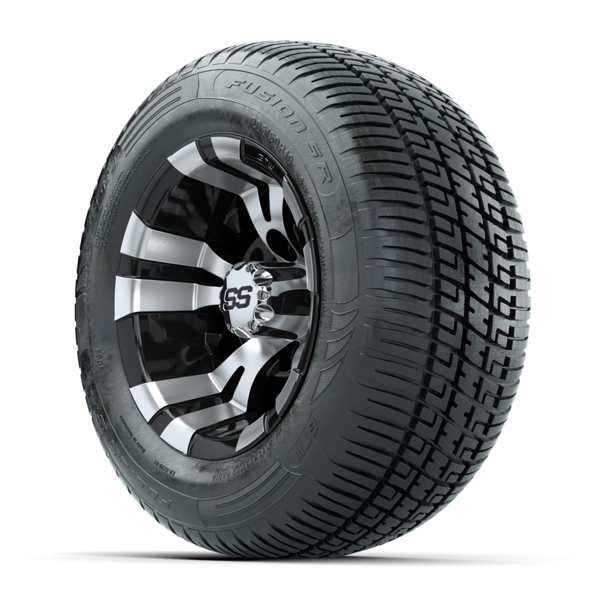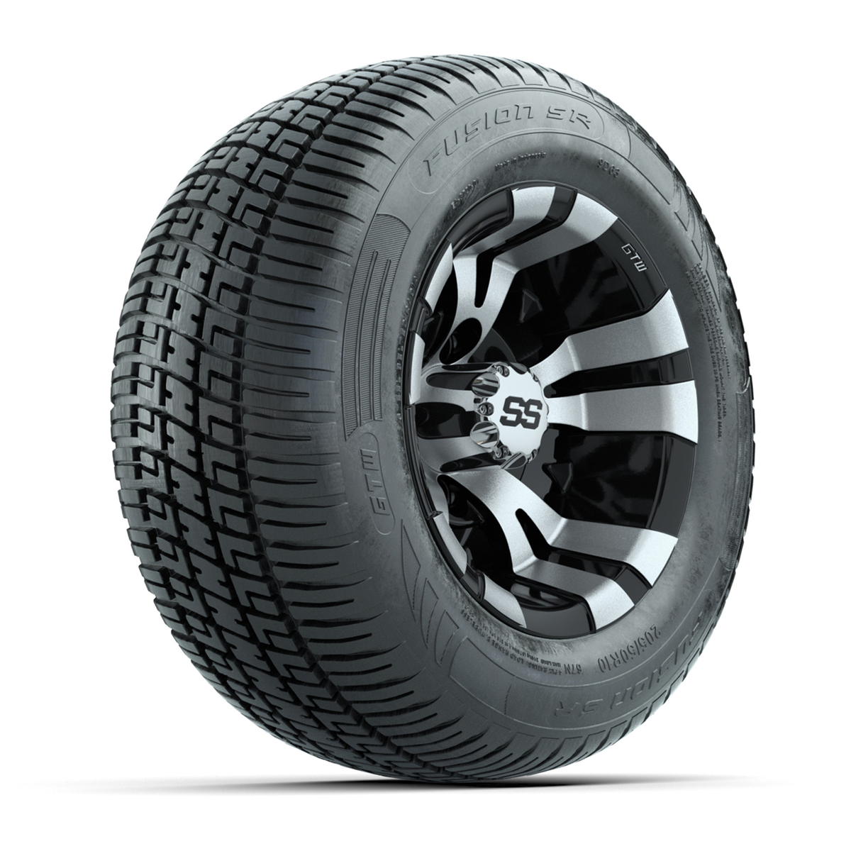 A set of (4) 10-inch GTW® Vampire Black/Machined golf cart wheels mounted on 205/50-R10 Fusion S/R Radial Steel Belt Street Tires