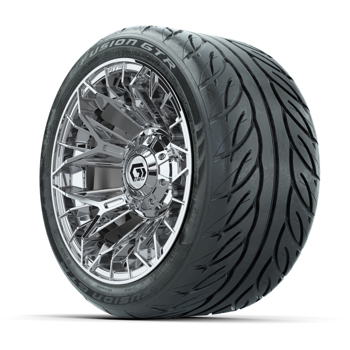 A set of (4) 12-inch GTW® Stellar Chrome golf cart wheels mounted on 215/40-R12 Fusion GTR Steel Belt Radial Street Tires