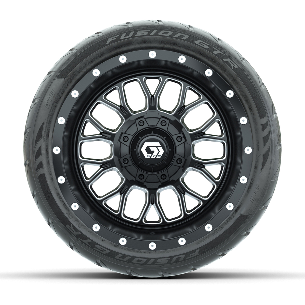 A set of (4) 12-inch GTW® Helix Black/Machined golf cart wheels mounted on 215/40-R12 Fusion GTR Steel Belt Radial Street Tires