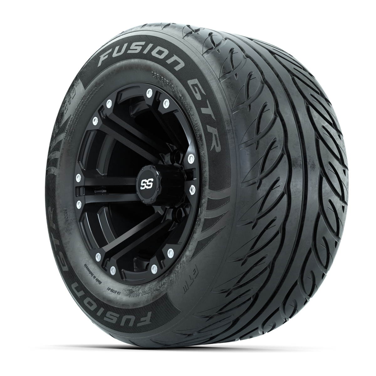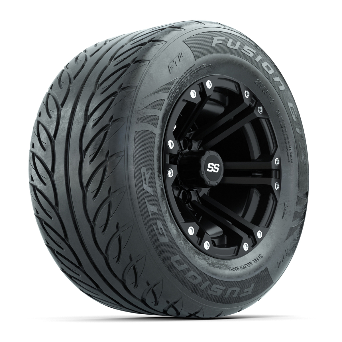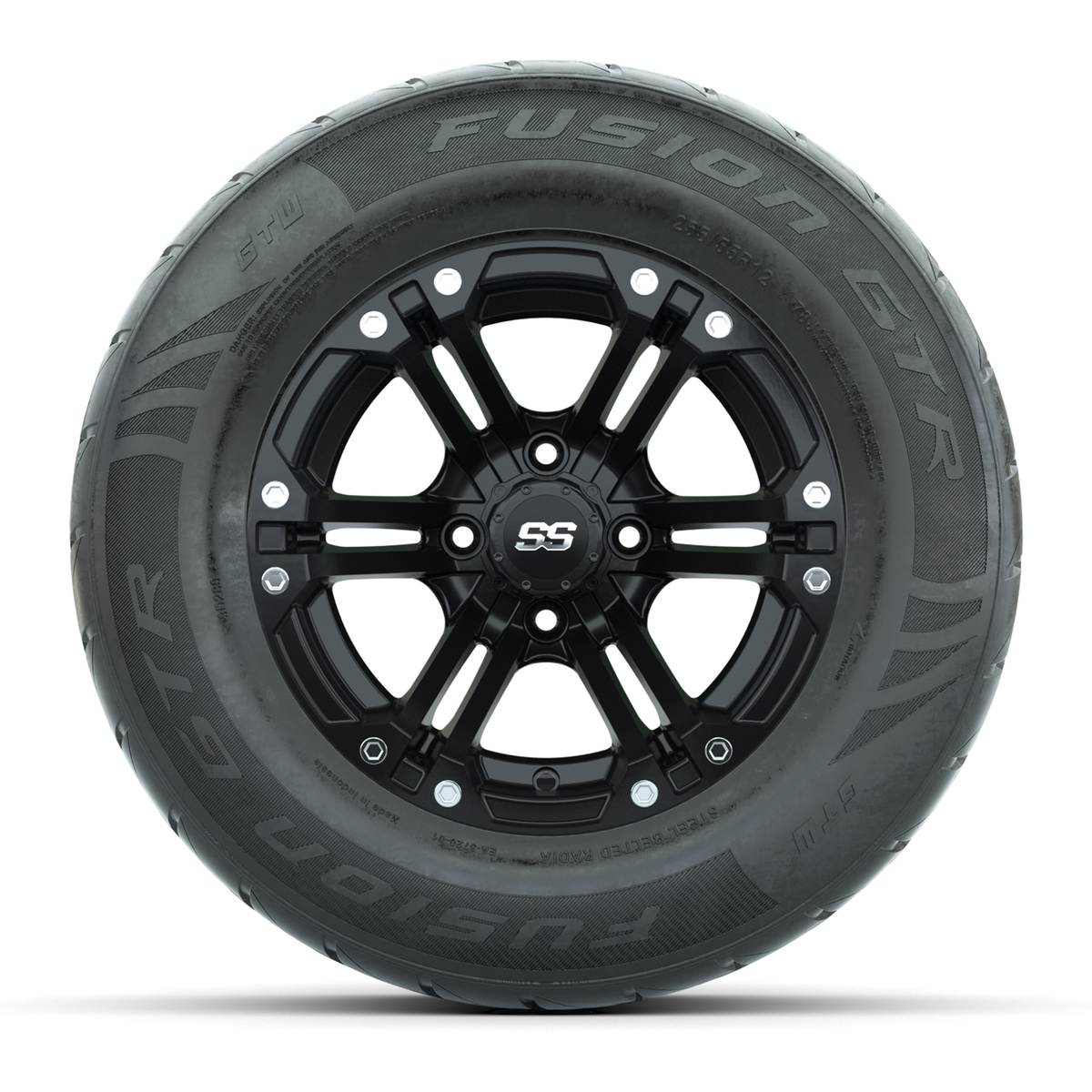 A set of (4) 12-inch GTW® Specter Matte Black golf cart wheels mounted on 255/55-R12 Fusion GTR Steel Belted Street Tires