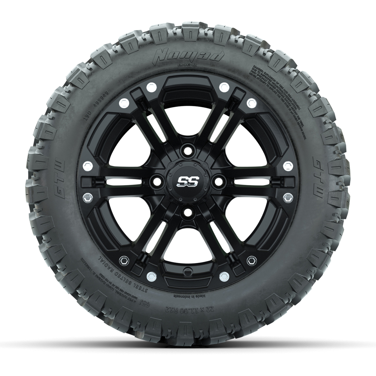A set of (4) 12-inch GTW® Specter Matte Black golf cart wheels mounted on 22X11-R12 GTW® Nomad Steel Belt Radial All-Terrain Tires