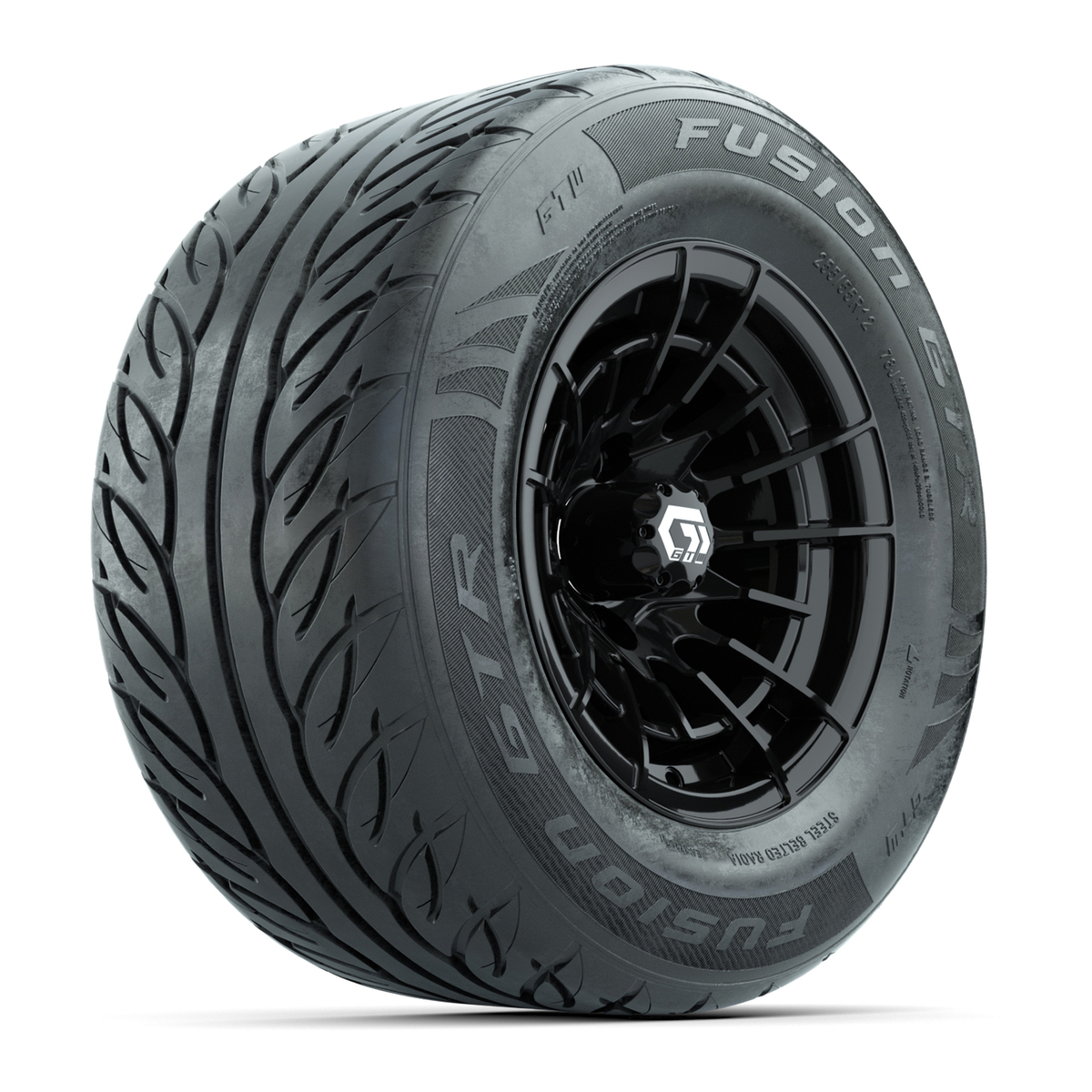 A set of (4) 12-inch GTW® Boost Gloss Black golf cart wheels mounted on 255/55-R12 Fusion GTR Steel Belted Street Tires