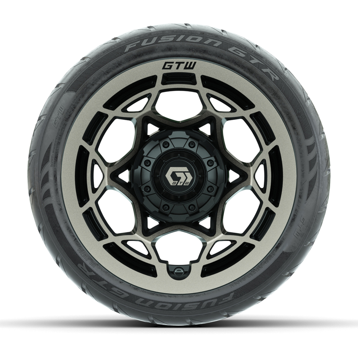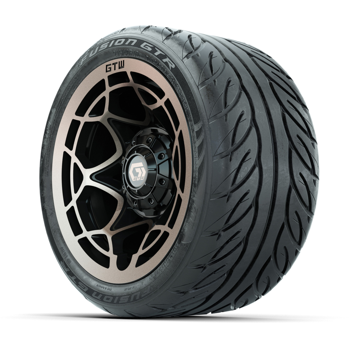 A set of (4) 12-inch GTW® Nexus Black with Bronze Face golf cart wheels mounted on 215/40-R12 Fusion GTR Steel Belt Radial Street Tires