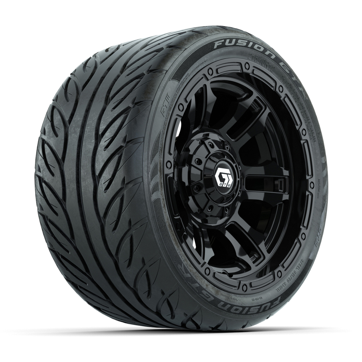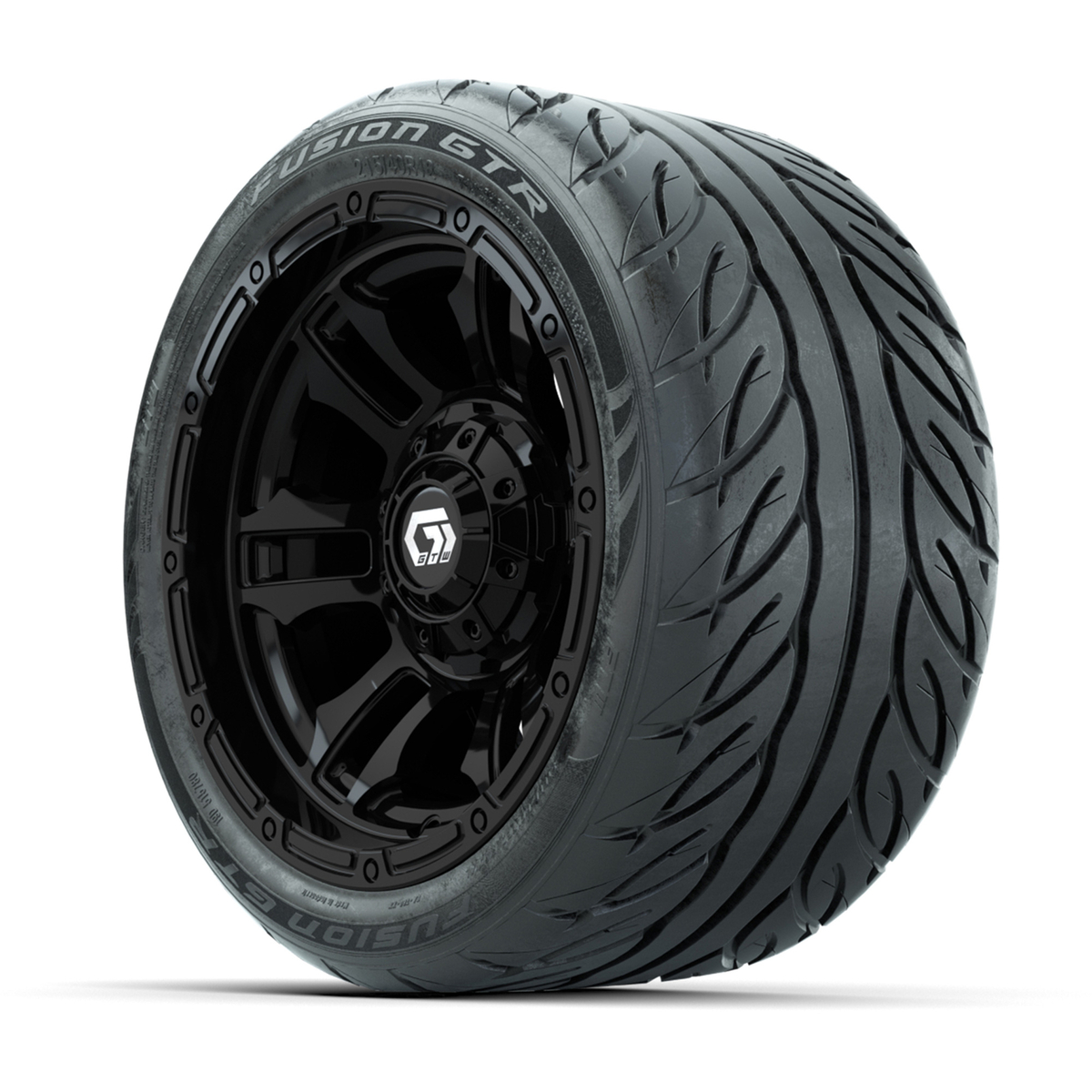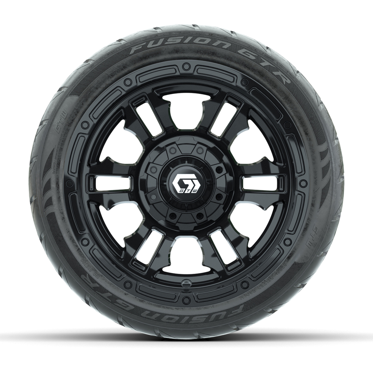 A set of (4) 12-inch GTW® Shogun Gloss Black golf cart wheels mounted on 215/40-R12 Fusion GTR Steel Belt Radial Street Tires