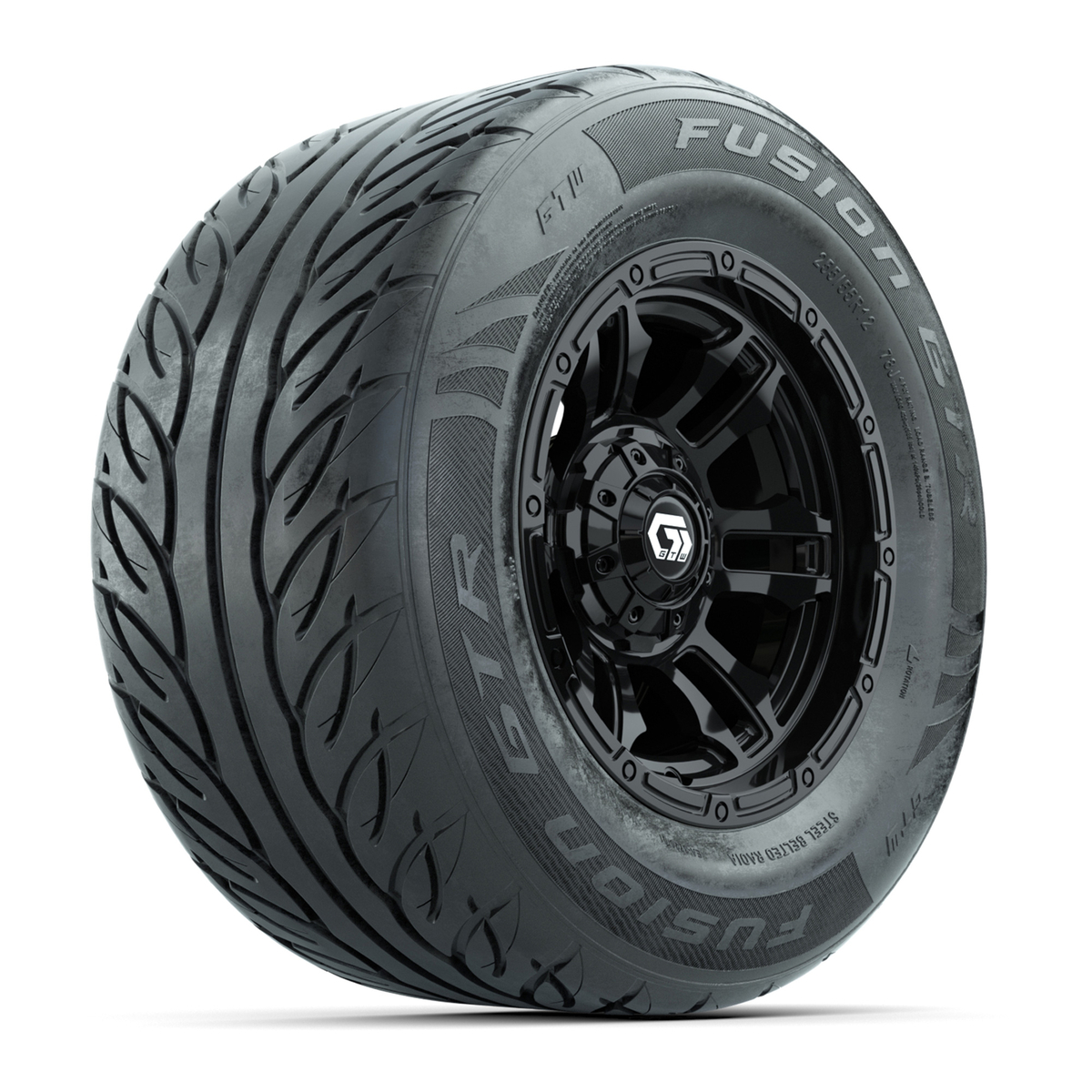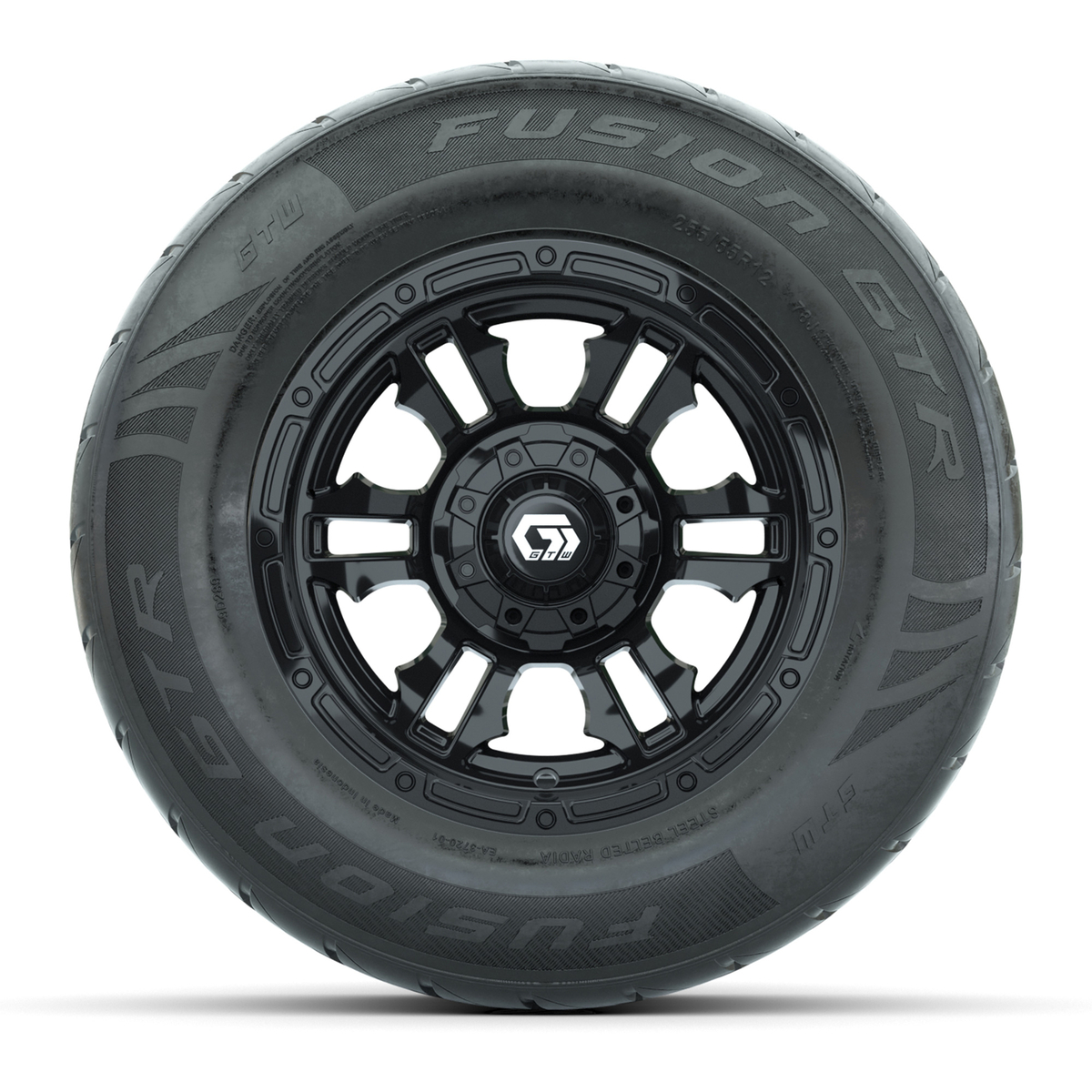 A set of (4) 12-inch GTW® Shogun Gloss Black golf cart wheels mounted on 255/55-R12 Fusion GTR Steel Belted Street Tires
