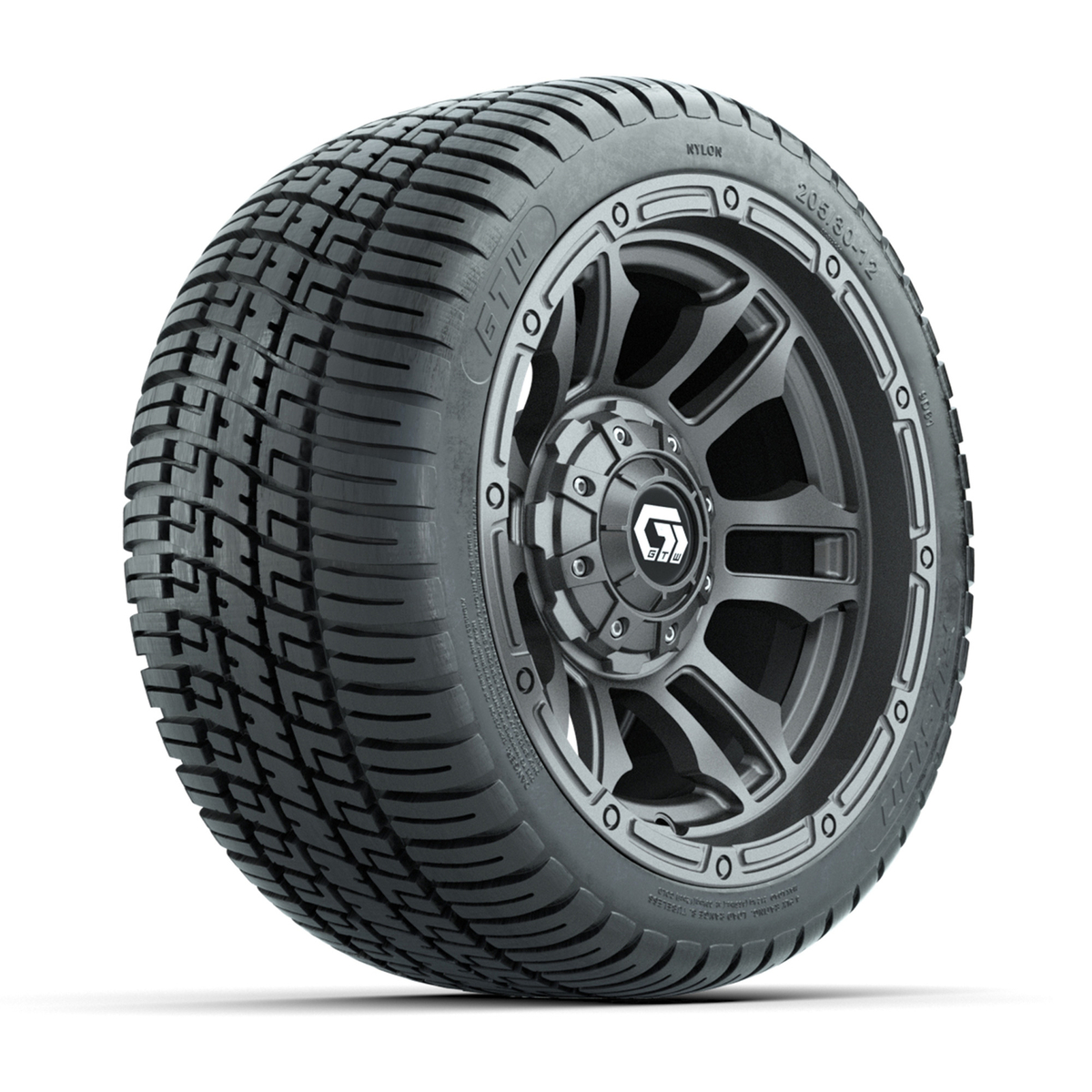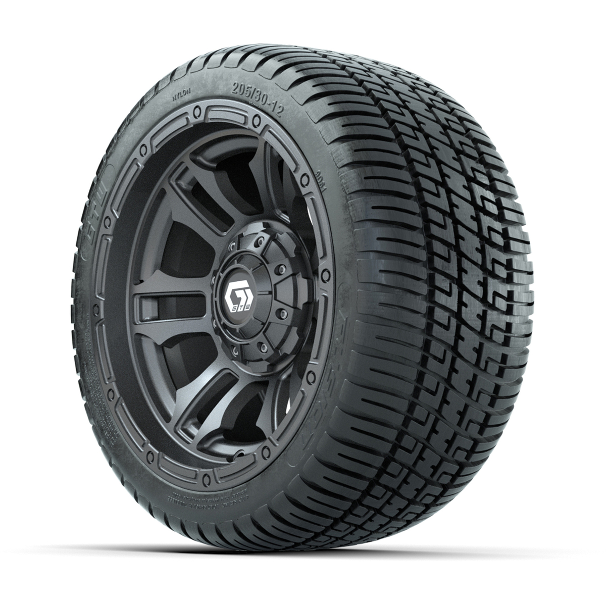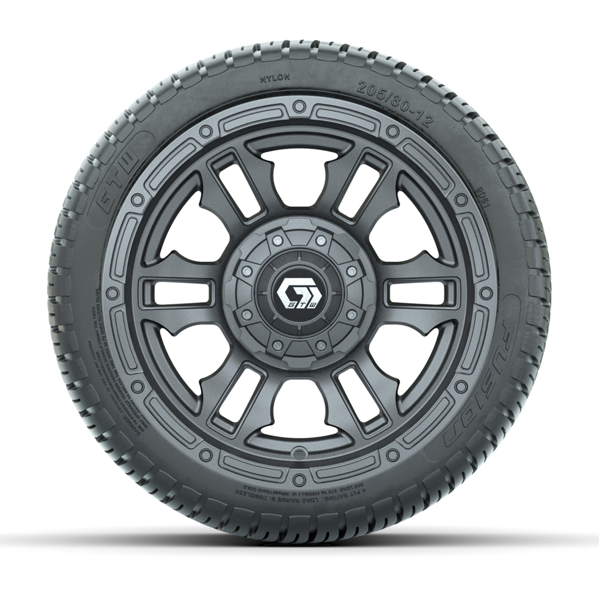 A set of (4) 12-inch GTW® Shogun Gunmetal golf cart wheels mounted on 205/30-12 Fusion Street Tires