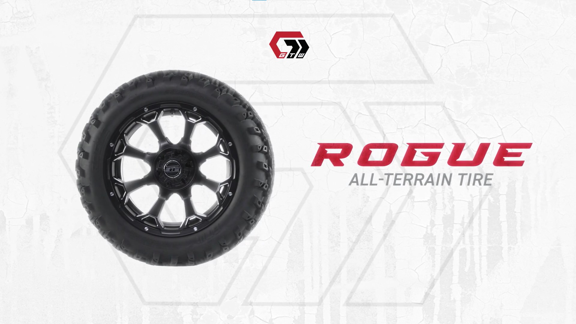 A set of (4) 12-inch GTW® Stealth Gloss Black golf cart wheels mounted on 23x10-12 GTW® Rogue all-terrain tires