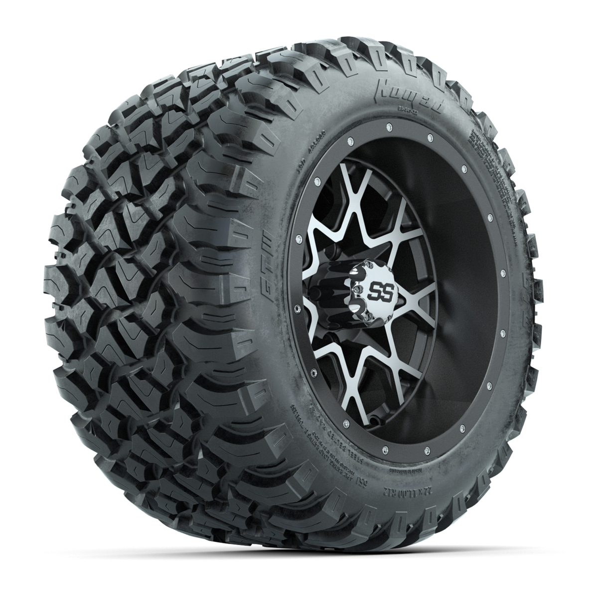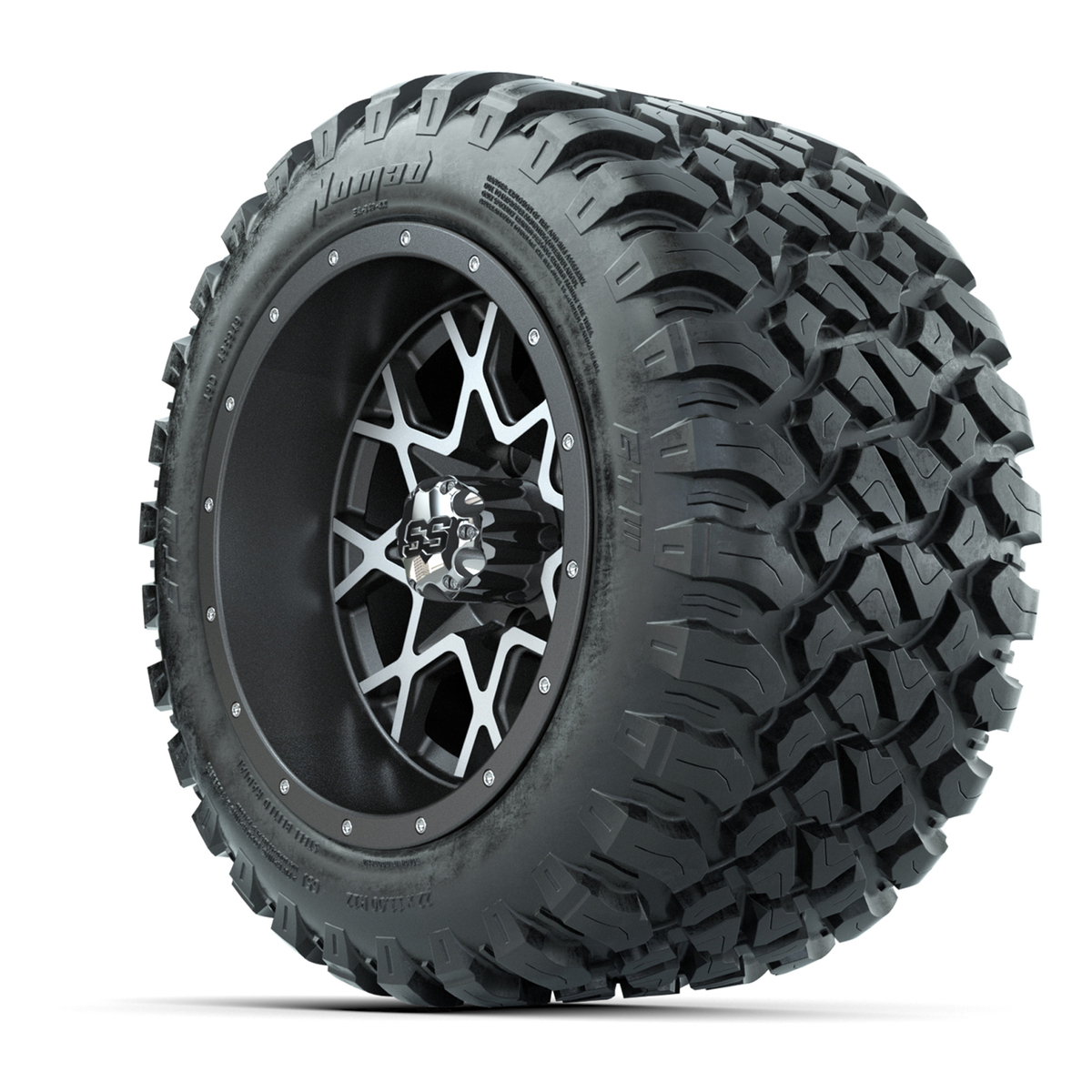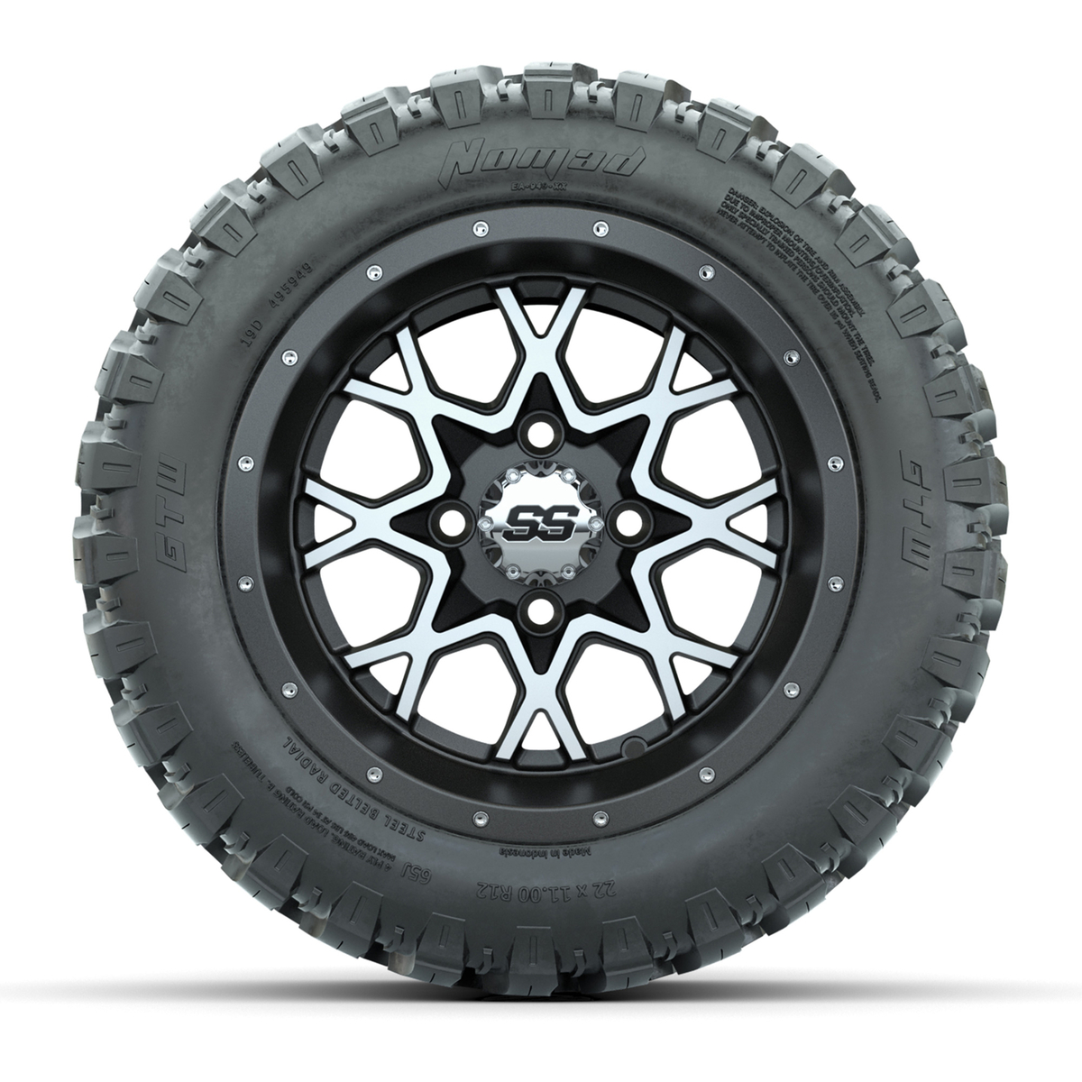 A set of (4) 12-inch GTW® Vortex 2 Matte Gray/Machined golf cart wheels mounted on 22X11-R12 GTW® Nomad Steel Belt Radial All-Terrain Tires