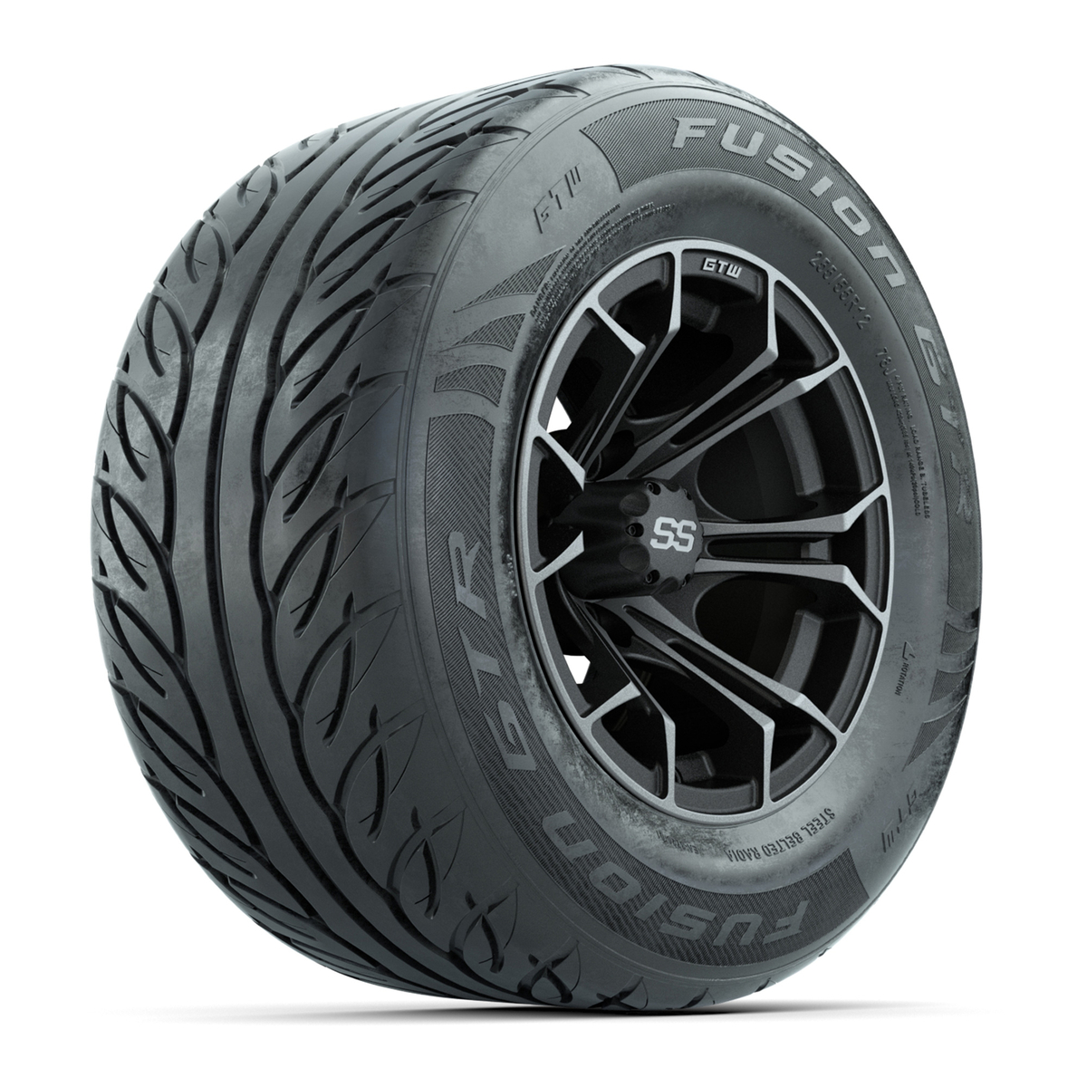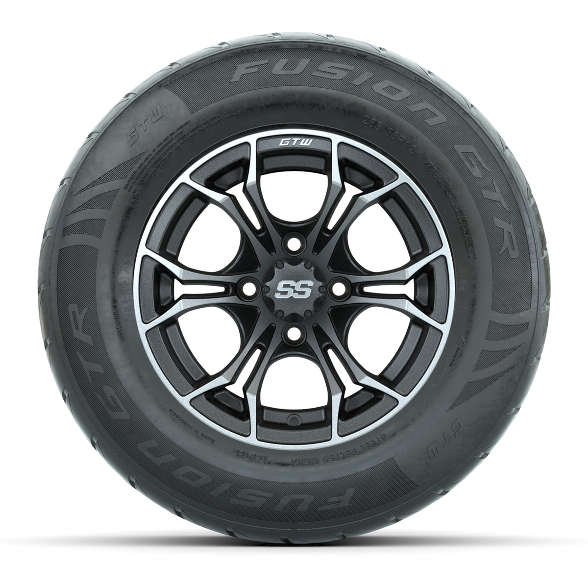 A set of (4) 12-inch GTW® Spyder Matte Gray/Machined golf cart wheels mounted on 255/55-R12 Fusion GTR Steel Belted Street Tires