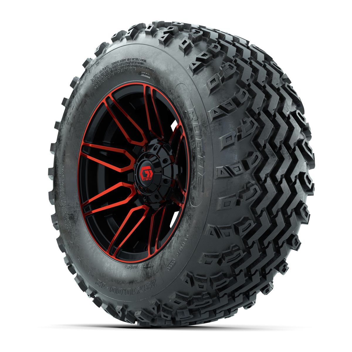 A set of (4) 12-inch GTW® Stealth Red/Machined golf cart wheels mounted on 23x10-12 GTW® Rogue all-terrain tires