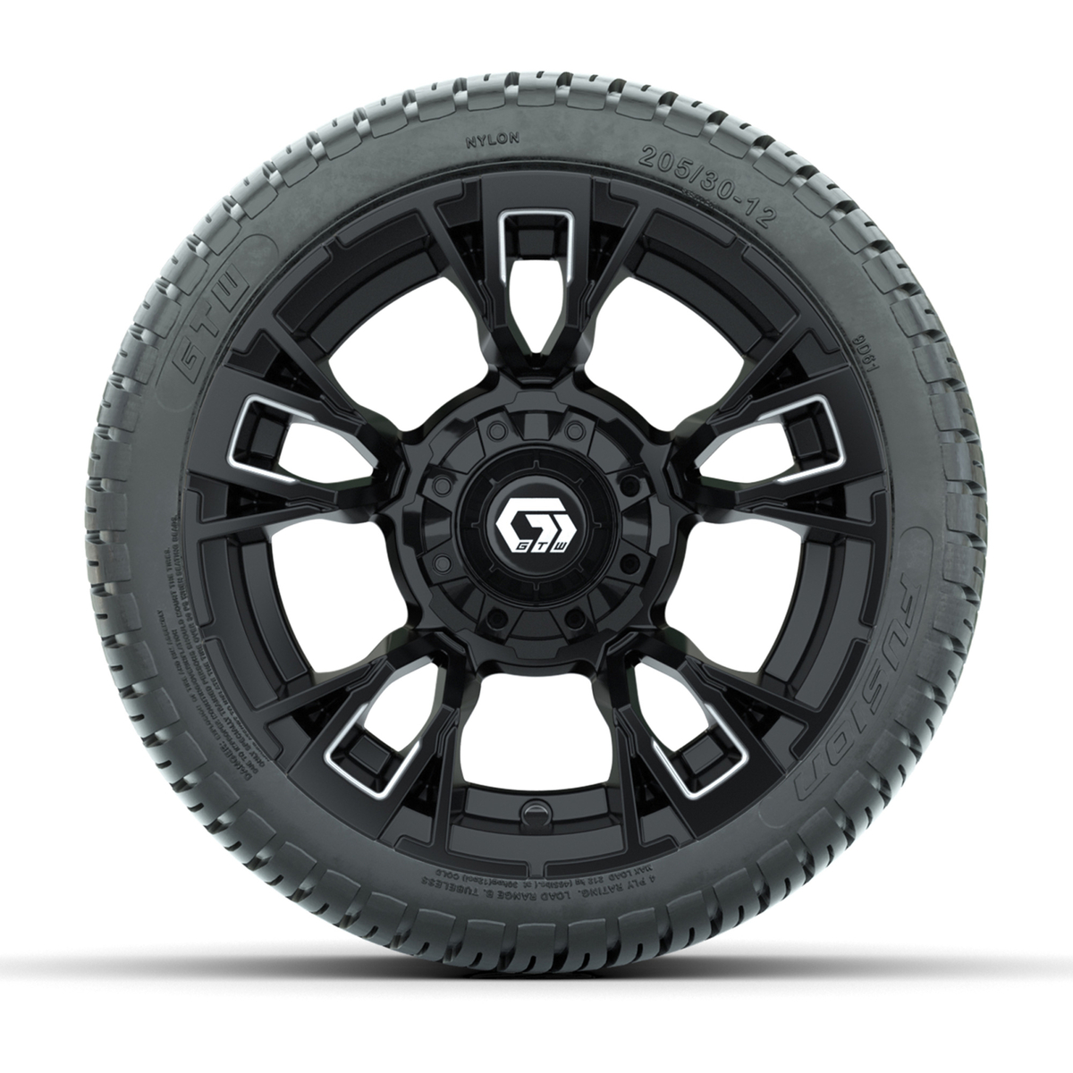 A set of (4) 12-inch GTW® Vandal Matte Black/Machined golf cart wheels mounted on 205/30-12 Fusion Street Tires