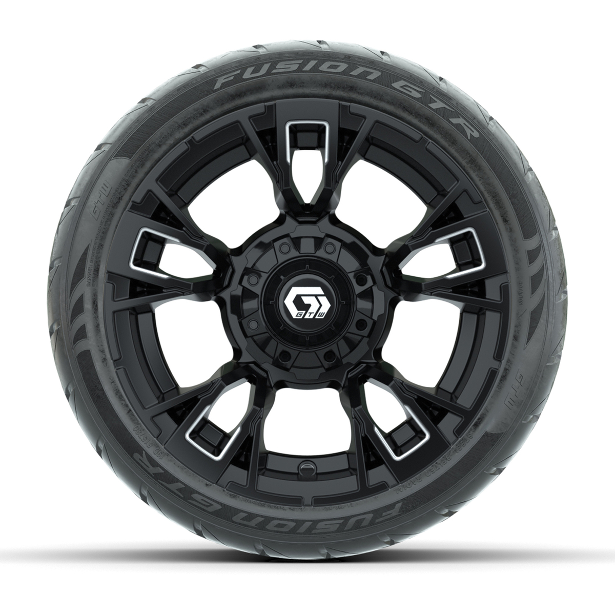 A set of (4) 12-inch GTW® Vandal Matte Black/Machined golf cart wheels mounted on 215/40-R12 Fusion GTR Steel Belt Radial Street Tires