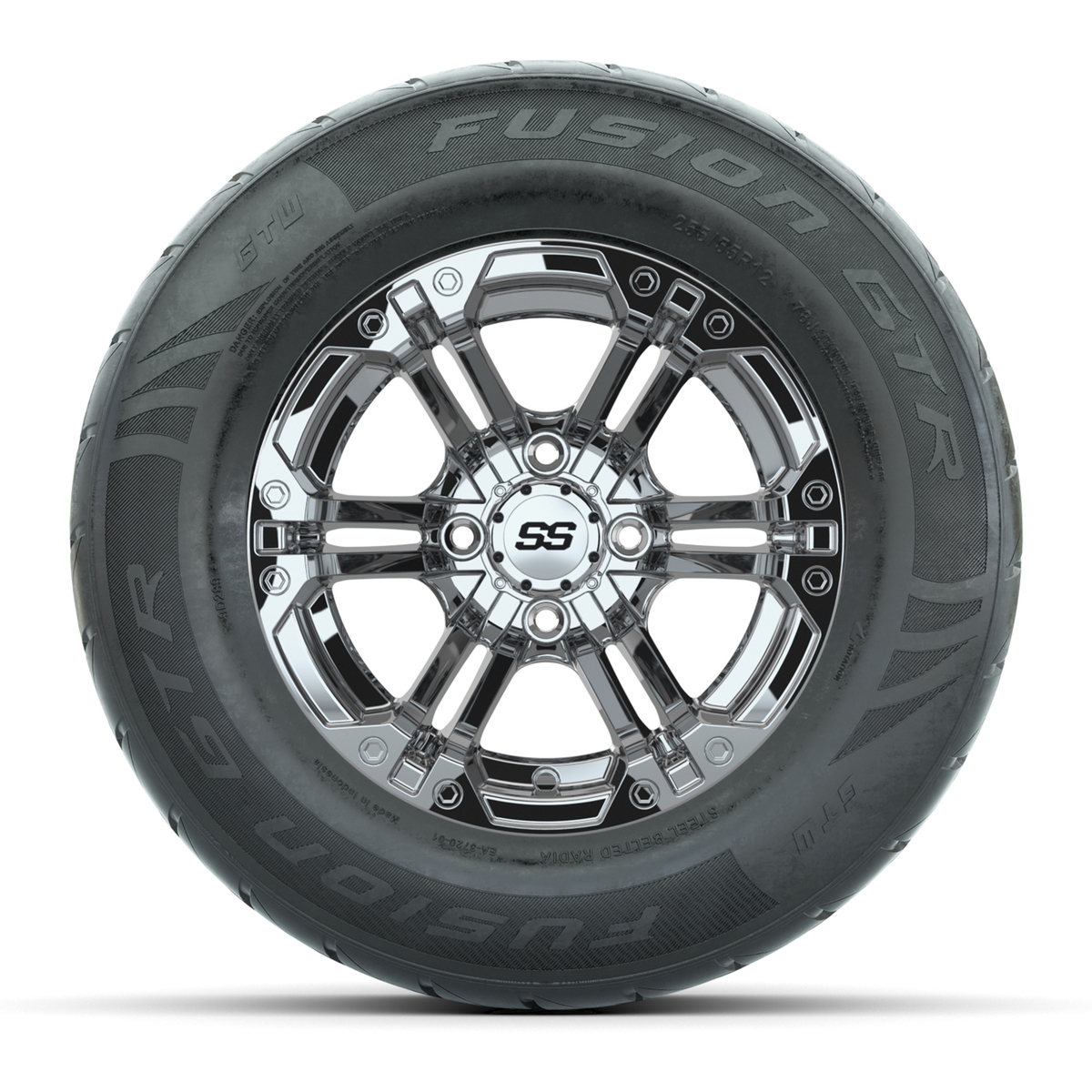 A set of (4) 12-inch GTW® Specter Chrome golf cart wheels mounted on 255/55-R12 Fusion GTR Steel Belted Street Tires