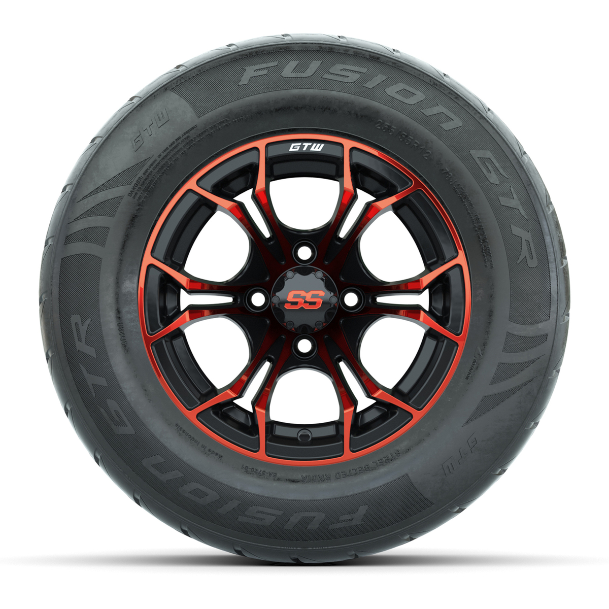 A set of (4) 12-inch GTW® Spyder Black/Red golf cart wheels mounted on 255/55-R12 Fusion GTR Steel Belted Street Tires