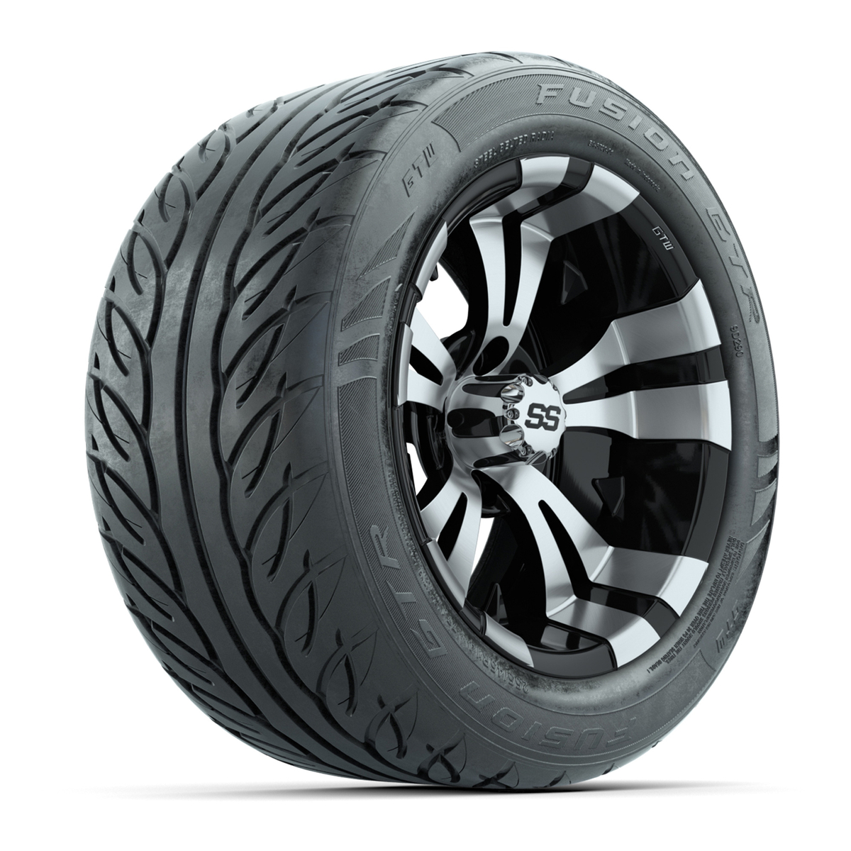 A set of (4) 14-inch GTW® Vampire Black/Machined golf cart wheels mounted on 255/45-R14 Fusion GTR Steel Belt Radial Street Tires