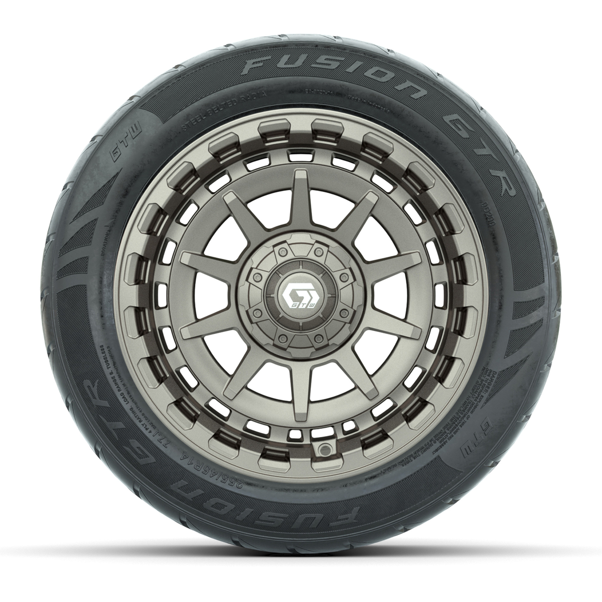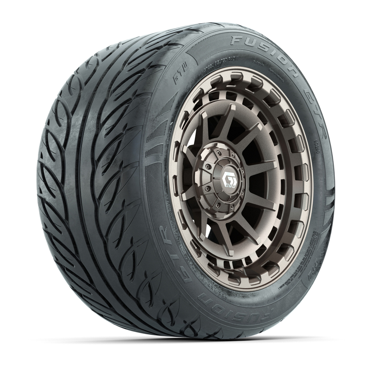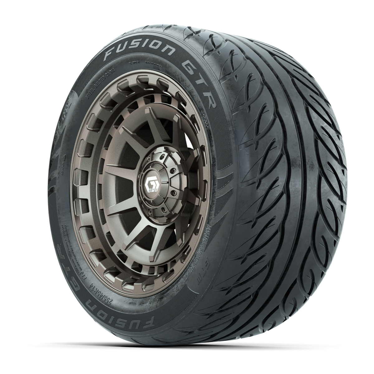 A set of (4) 14-inch GTW® Barricade Bronze golf cart wheels mounted on 255/45-R14 Fusion GTR Steel Belt Radial Street Tires