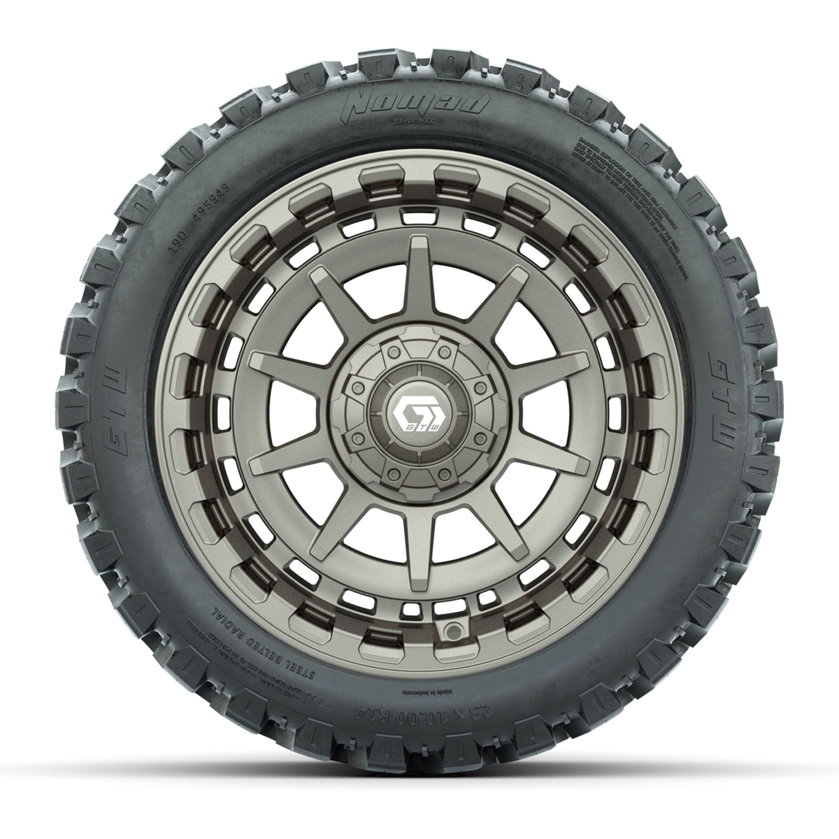 A set of (4) 14-inch GTW® Barricade Bronze golf cart wheels mounted on 23x10-R14 Nomad Steel Belt Radial All-Terrain Tires